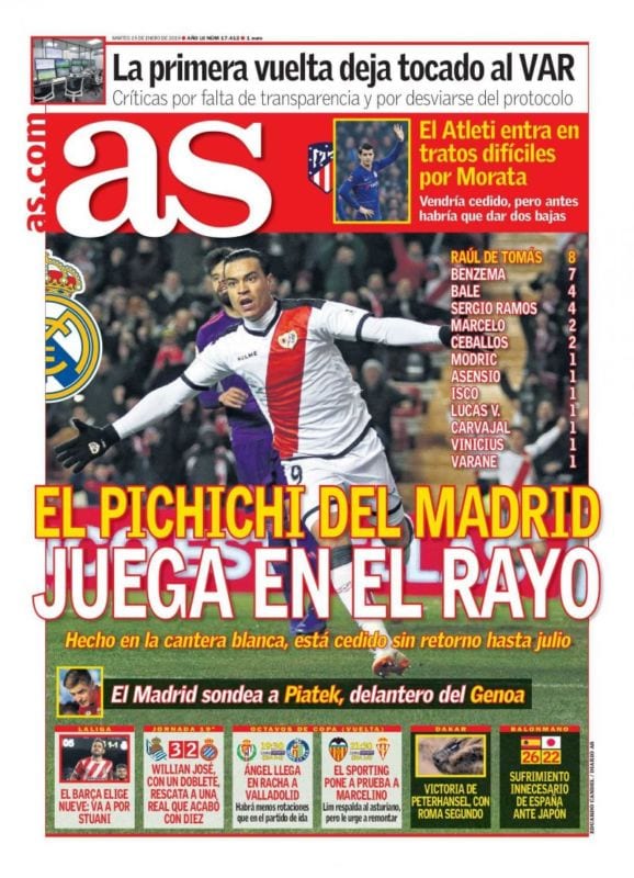 Empezamos por nuestro caballo favorito en cada carrera mañanera. As trae a portada a Raúl de Tomás, delantero con contrato en el Real Madrid y cesión en el Rayo Vallecano, donde como recoge la Ouija (y las matemáticas no mienten) lleva en lo que va de año más goles que Benzema o Bale. No hay casi amarillismo, no hay casi oportunismo y no hay casi afán nocivo en eso de titular "El pichichi del Madrid juega en el Rayo", mensaje que se nos traslada con afán puramente informativo (claro, claro). ¿Qué queremos decir, Relaño de nuestros desvelos? ¿Que en verano debió el Madrid optar por De Tomás en lugar de hacerlo por (digamos) Mariano? ¿Diríamos lo mismo si Mariano no estuviera pasándolas canutas por causa de sus presentes problemas con el nervio ciático, cosa que nadie calculaba cuando hubo que optar por una u otra opción?