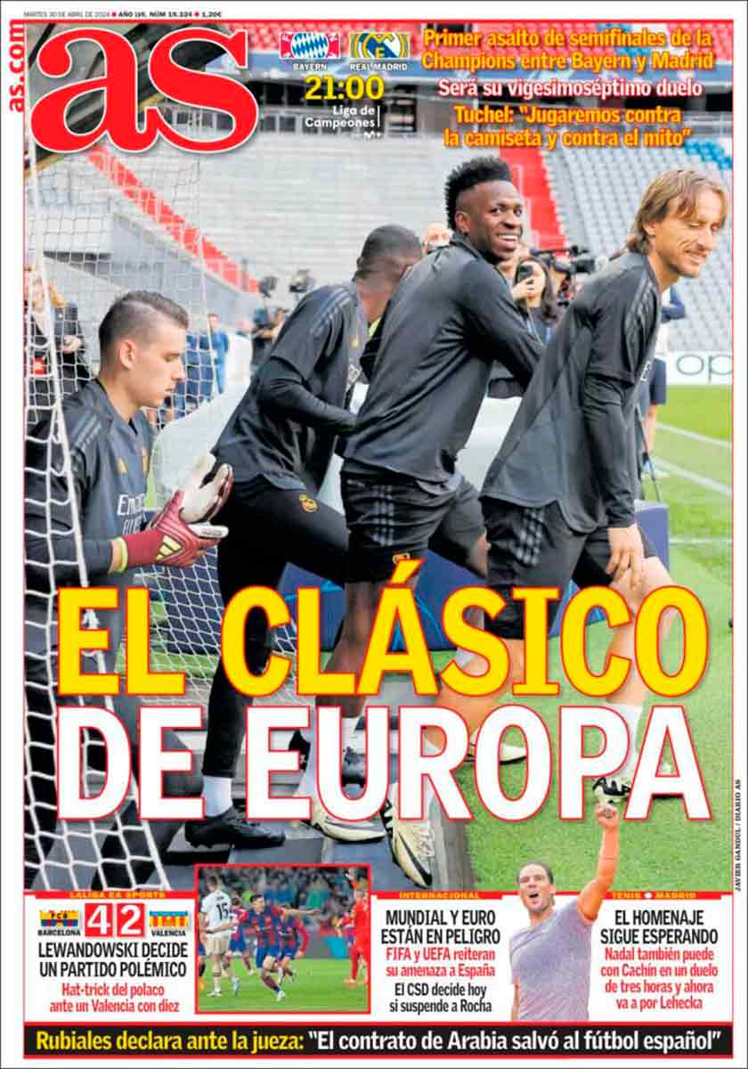 Buenos días. Solo hay dos cosas en el mundo que no pierden un ápice de intensidad por muchas veces que se repitan: los enamoramientos y las Copas de Europa, porque, como dice el maestro Guasch, un Bayern de Múnich-Real Madrid es Copa de Europa, y un City-Real Madrid es Champions. El partido de hoy es el clásico de Europa, según refleja a la perfección la portada de As.