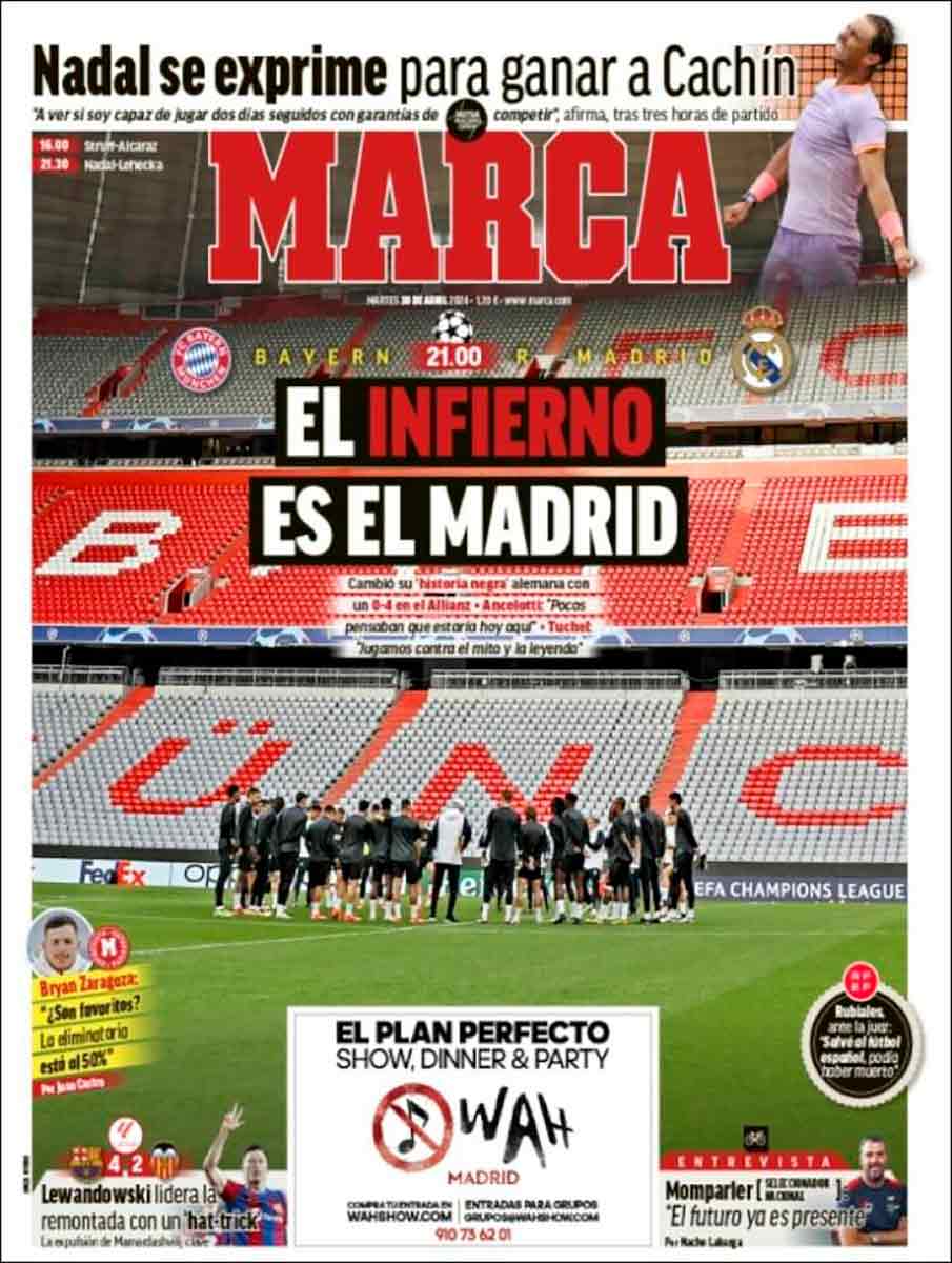 La portada de Marca es el reflejo de que el Madrid no solo remonta partidos, sino que remonta la historia. Una historia cuyas páginas rezaban que los blancos no ganaban en Alemania y ahora, como dice Antonio Valderrama hoy en La Galerna, «en las últimas tres eliminatorias el Real ha jugado en Múnich más tranquilo, con más temple, sosiego y mando, que en el campo del Mallorca o en Mestalla».