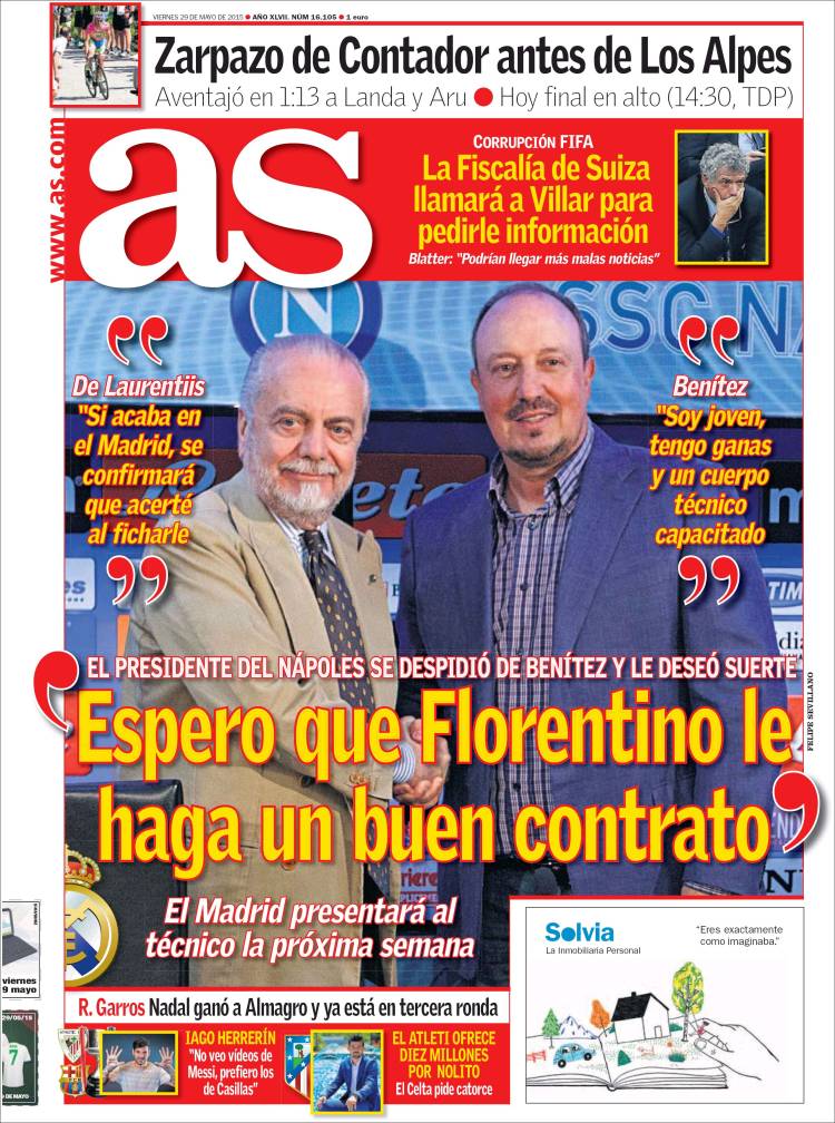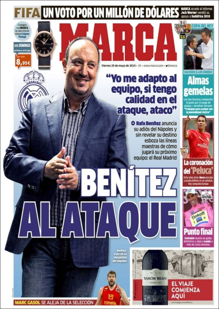 "Benítez al ataque", titula Marca, se diría que de manera un tanto aventurada. Aún no ha aterrizado este señor y no solo se especula sobre el modo en que va a jugar, sino que se asegura sin aparente duda. La rotundidad viene motivada, al parecer, por unas declaraciones del propio Benítez en las cuales el ex de los Reds dice tener por filosofía el adaptar su estilo de juego a las plantillas que le otorgan. Es así que, teniendo el Madrid buenos jugadores de ataque, ahora Benítez no tiene más remedio que jugar desde unas premisas de fútbol ofensivo.