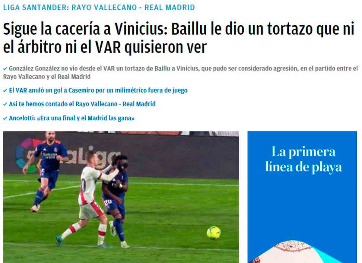 Claro que sabemos que agredir a Vinícius está admitido en el reglamento, o al menos en el que maneja González González. Él era el árbitro de VAR también en Vallecas cuando Balliu atizó con ambas manos al brasileño en la Liga 2021-22. Jugada que se ha repetido este año, por cierto.