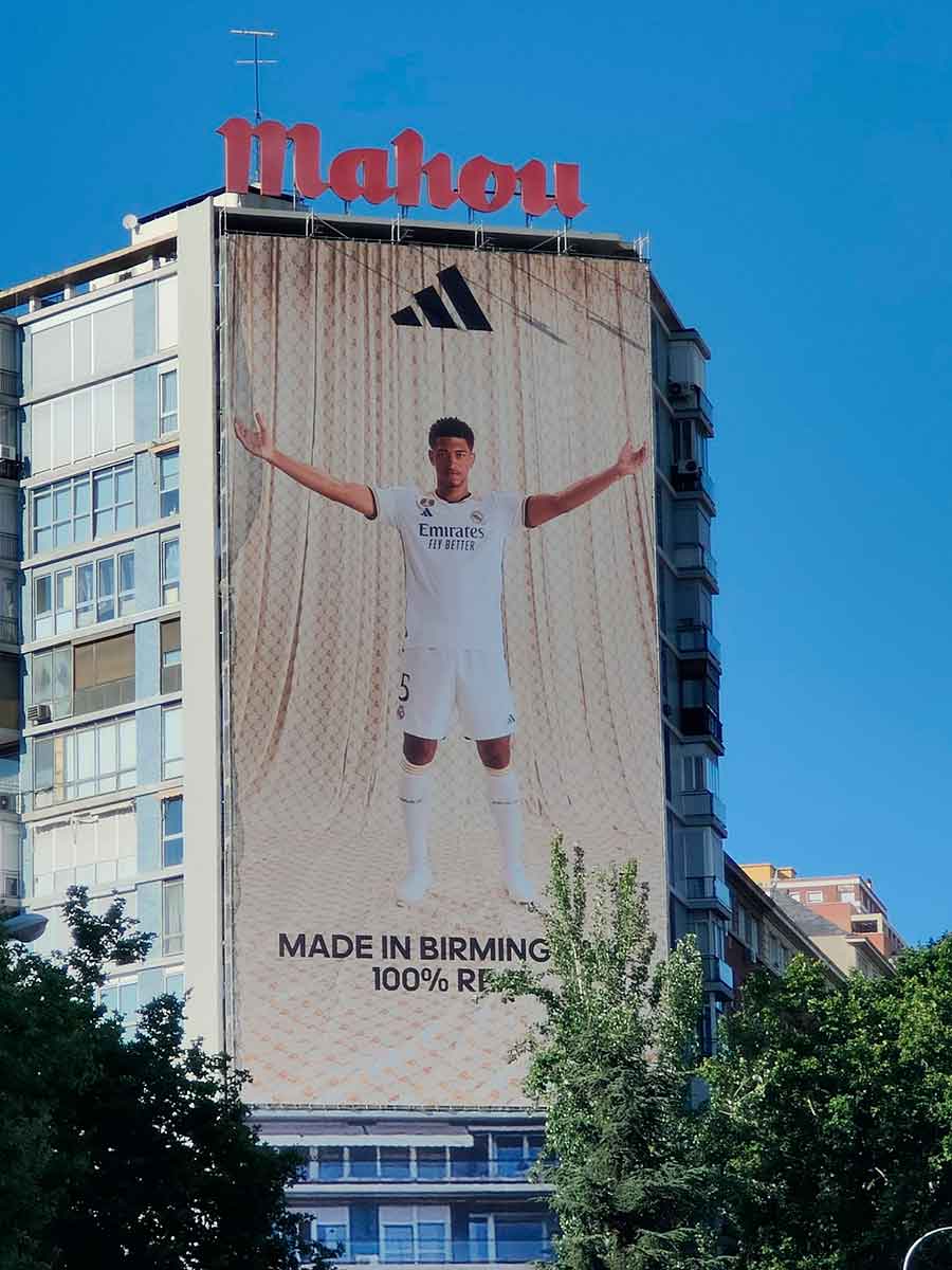 Me llega ahora esta foto, que revela otro uso publicitario de otra fachada, también madrileñísima. Me cuentan que Jude Bellingham lo está petando en lo de vender camisetas, que es solo una de las cosas para las que ha venido, y seguro que esta megalona contribuirá en la tarea de colocar dos o tres más. Es un anuncio de Adidas, claro, y me ha llamado la atención el edificio concreto, situado en la Plaza de Cristo Rey, entre Isaac Peral y San Francisco de Sales, al que va aparejada una historia cinematográfica. No solo es una buena elección por parte del anunciante, al tratarse de una de las primeras visiones que aparecen en el horizonte del conductor cuando entra en la capital por la A6, sino que tiene además un simbolismo muy particular, o a lo mejor es sólo que yo lo quiero ver.