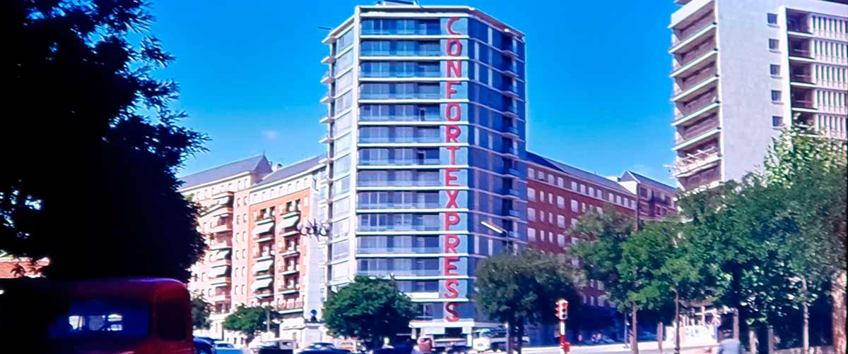En ese edificio transcurría parte de la acción de la película Los Tramposos (Pedro Lazaga, 1959), uno de los clásicos de la comedia española de toda la vida. En aquel enredo descacharrante, que entre otras grandes aportaciones al género humano inventó (¿o solo destripó?) el timo de la estampita, el inmueble encarnaba la sede de Confort Express, una agencia de viajes en la que trabajaban como secretarias Laurita Valenzuela (qepd) y Conchita Velasco (gran madridista), bajo las órdenes del estricto José María Rodero.