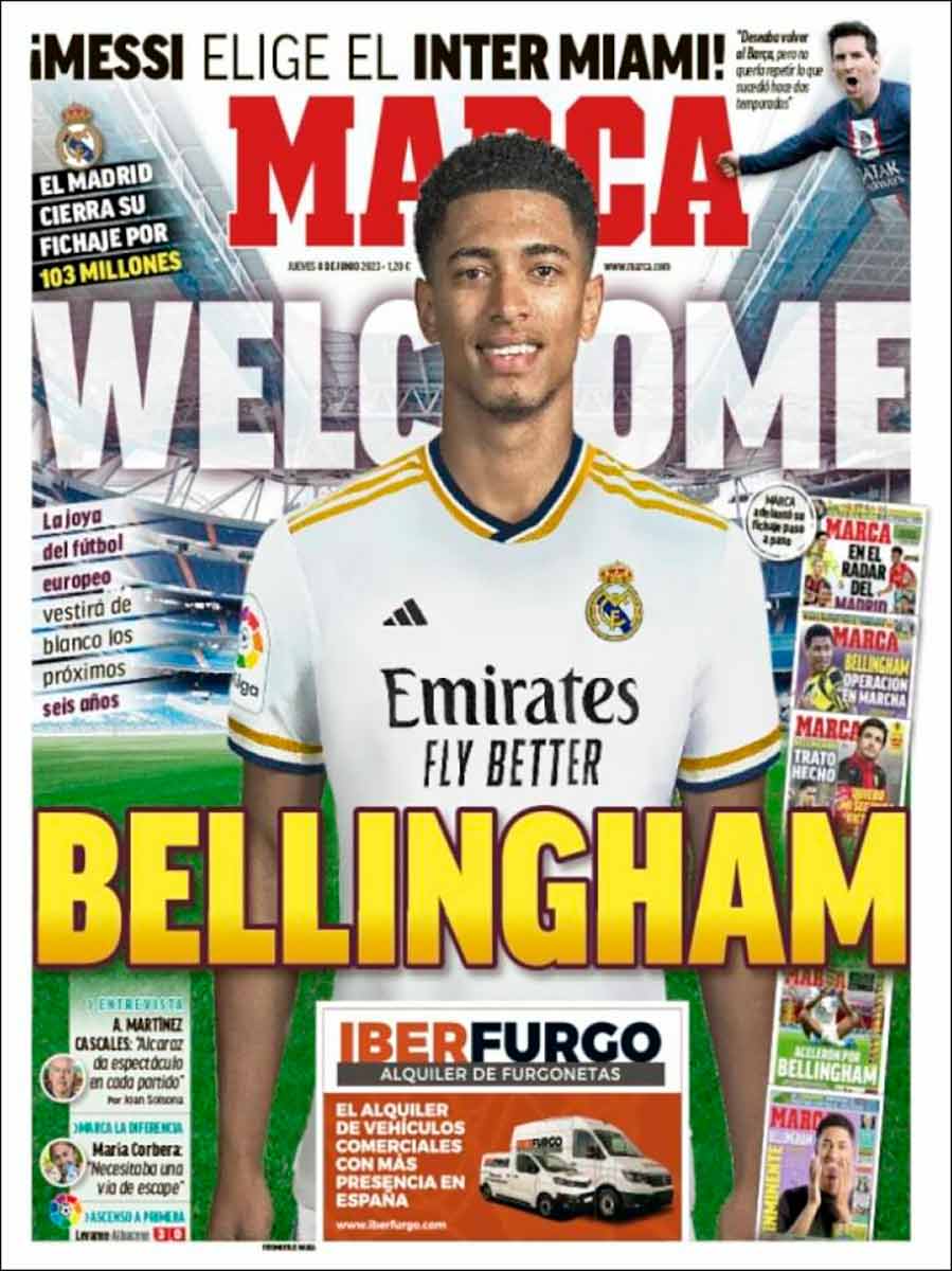 Marca sigue la estela de As (o viceversa), pero su bienvenida en es inglés, idioma natal de Jude, y si bien no lo recibe con el manido Hey Jude (sin coma del vocativo. Ay, Paul), lo hace con un Welcome anclado en el cogote de Bellingham. Welcome to the hotel Concha Espina. Hay un new kid in town.