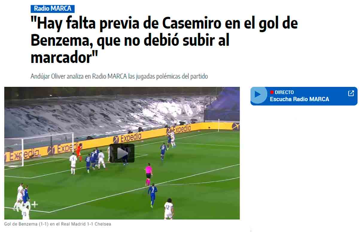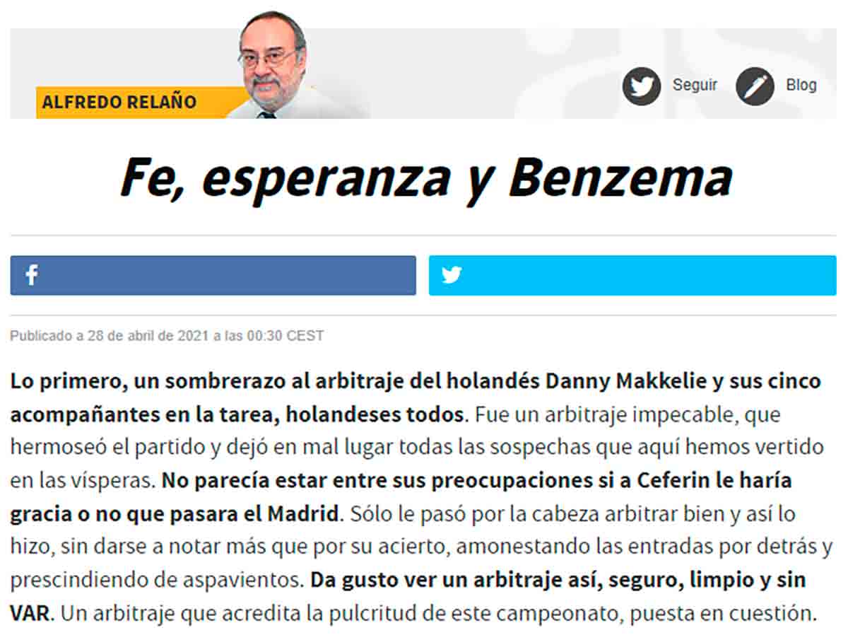 A Andújar —conocido como Mr. Rabillo por razones que nada tienen que ver con tamaños que no importan— lo tienen en Radio Marca para epatar al personal con excentricidades antimadridistas como esta. Para ver falta de Casemiro a Azpilicueta, tienes que ver también falta de Bale a Jordi Alba en el gol que de forma mítica anuló Hernández Hernández al galés en el Camp Nou. Sucede que ayer no arbitró Hernández Hernández ni reverdeció laureles el rabillo de Andújar, afortunadamente retirado de la escena pública (Andújar, no necesariamente el rabillo). El arbitraje corrió a cargo de Danny Makkelie (no confundir con Makelele, pues el tamaño sigue sin importar en este portanálisis). El holandés estuvo “impecable” según reza la portada de Marca, aunque tanto a nosotros como a Alberto Cosín (leed su valoración arbitral) nos parece que no anduvo muy justo en el reparto de cartulinas. No fue el temido arbitraje UEFA porque las jugadas en las áreas no dieron para ello, no hubo polémicas gordas, pero en el aspecto disciplinario la cosa se inclinó del lado inglés de manera diáfana. Relaño, en As, se postra también en su columna ante Makkelie, a quien dedica untuosamente la mitad de su columna sobre el partido.