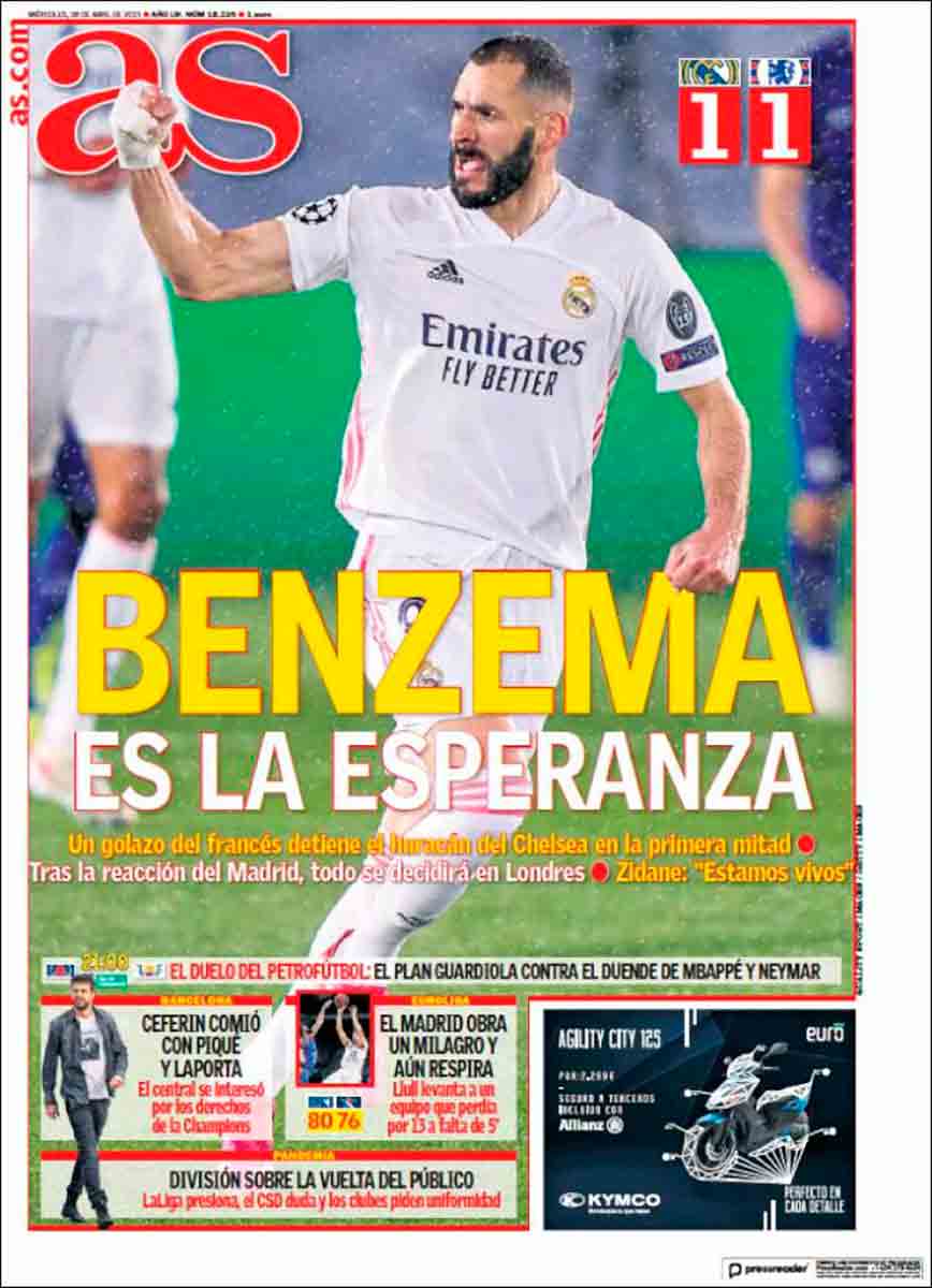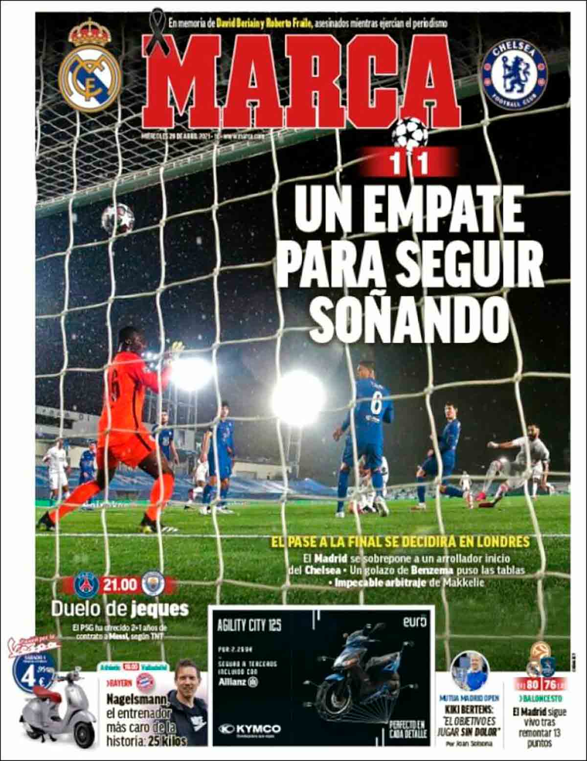 “Un empate para seguir soñando”, titula Marca en cuerpo de letra de tamaño discreto, sin duda para no restar brillo a la extraordinaria fotografía del gol de Benzema desde detrás de la portería de Mendy. Qué partido, y en particular qué primer tiempo del francés, que sembró el caos en la defensa londinense con un disparo anterior al poste, un deslumbrante juego asociativo y el remate en semichilena cuyo resultado nos ofrece Marca en toda su gloria. La maniobra de Karim fue antológica, aunque a fin de restar mérito a la misma el inefable Andújar Oliver dijo en Radio Marca que el gol debió ser invalidado por una supuesta falta de Casemiro en el salto previo con Azpilicueta. Es, si acaso, al contrario, fue Azpilicueta quien se metió en el camino de Casemiro cuando este ya llevaba un cuarto de hora limpiamente suspendido en el aire, pero que no pase un día sin que se arroje sobre cualquier mérito del Madrid la sombra ominosa de la duda.