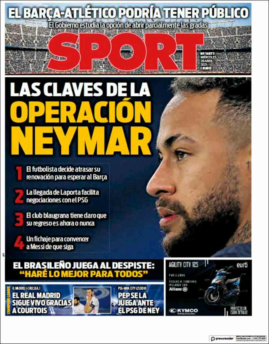 El resto de portadas abundan en la esperanza de Karim (As); la emocionante remontada del Madrid de baloncesto, que forzó el cuarto partido en la agónica Euroliga (también As); el fichaje de Neymar por el Barça, que vuelve a volver a la entidad blaugrana, no sabemos si esta vez de la mano de Lautaro o no (Sport); y el posible fichaje de Messi por el PSG (Mundo Deportivo). Por nuestra parte, mientras Andújar Oliver no observe infracción alguna por el rabillo del ojo, no tenemos nada que oponer a estas primeras planas. Si acaso eso, aclarar si Neymar viene al Barça solo o con Lautaro, como tantas otras veces.