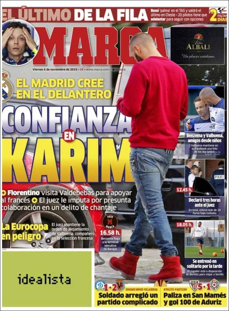 “Confianza en Karim” proclama no obstante Marca en una digna portada, añadiendo que el Madrid cree en el delantero. En nuestro portanálisis de ayer, sugeríamos que el club hablase con el jugador, y con quien fuera preciso, en una suerte de investigación interna. Entendemos que el club ha llevado a cabo estas gestiones y se ha decantado por creer en la inocencia del jugador, al menos, mientras no se demuestre lo contrario. Nos parece una postura lógica en las presentes circunstancias.