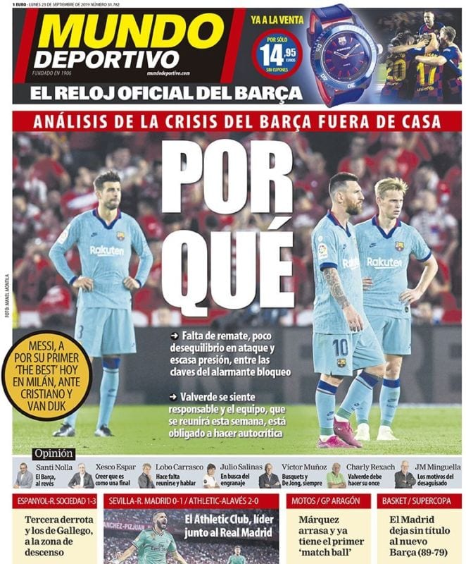 “Un partido serio”., “Así sí “ y finalmente “La crisis toma el puente aéreo”. Pocas jornadas más propicias al tópico (benditos tópicos los de hoy) que la que culminó en Nervión, y cuánta dicha produce ver al Barça debatirse en dudas que mueven incluso a Mundo Deportivo a mourinhizarse, hasta ese punto llega en este momento la crisis de identidad del culerío. Ese “Por qué?” de la cubierta de los del Conde de Godó, grande de España, recuerda inevitablemente a los purqués de José Mourinho en la sempiterna rueda de prensa de Unicef, de modo que la “rectificación de rumbo inmediata” que reclama Sport desde la suya podría consistir, puestos a avanzar en la pérdida de identidad blaugrana, en poner a Luis Suárez de lateral derecho o exponer listas de errores arbitrales en los encuentros con la prensa. Pena que errores en contra del Barça casi no haya. Habrá que encontrar modos alternativos de mourinhizar al culerío, habida cuenta de de la trascendental victoria de Sevilla aleja al portugués de Valdebebas.
