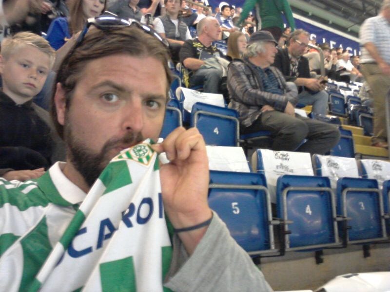No así de nuestro protagonista, me apresuro a aclarar, cuyo aspecto hippy no está reñido con la observancia de una higiene escrupulosa. Ni siquiera al día siguiente, tras pasar por la prueba del nueve de las muchedumbres, olía excesivamente mal su camiseta verdiblanca, tan chocante en medio de la marea vikinga. Sí: el bético de la Duodécima es amigo mío, y me ha parecido que el jugar esta noche contra el equipo de sus amores me otorgaba una buena excusa para presentároslo. Se llama Charly Durán. No sé muy bien qué edad tiene (los amantes del prog rock, su otra gran pasión junto al Betis, no tienen edad) y trabaja en una empresa de seguros de coche con sede nacional en Sevilla y sede mundial en Cardiff, que es lo que explica su presencia allí aquel día.