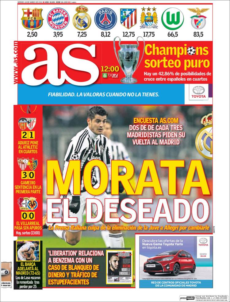 1. Me imagino que tras su estupendo partido el otro día, y esa jugada que AS calificó como una jugada que pasará a la historia del fútbol, así, sin exagerar, Álvaro Morata va a ser portada recurrente para atizar al Madrid: "La afición exige el retorno de Morata", "Morata le costaría ahora al Madrid tropecientos mil millones", "Florentino despreció al delantero que arrasa en el continente", y tal.