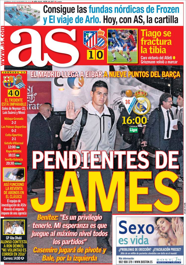 As Portada 29.11.15También aparece James en la portada de As, también hace un gesto -esta vez de saludo- con su mano derecha, pero aquí, como corresponde al espíritu de Relaño, el colombiano no tiene ningún fuego en la mirada, no nos llama a nada, está lejos de motivar a la acción o la adhesión. Si en la foto de Marca latía un halo de esperanza y de ímpetu, en la de As no hay nada más que un tipo en chándal que saluda al bajarse de un autobús, un tipo cualquiera con mochila, tan cualquiera como uno de nosotros.