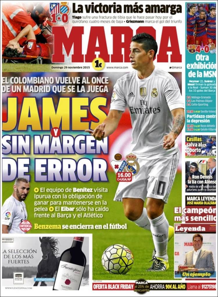 Marca Portada 29.11.15El 10 tiene la pelota y busca anhelante a un compañero. James mira al frente y quiere asociarse. No seremos nosotros quienes no le devolvamos la mirada. El joven colombiano acompaña su intención con su mano derecha, trazando un gesto de llamada, convocando a la cercanía, "ven que te la paso", y nosotros vamos. Y ello pese a que la portada de Marca hoy parece más propia de las ofertas de una gran superficie, tan llena de recuadros, tipos de letra, informaciones dispares, fotos, resultados, vino y hasta un caballo negro a galope. Todo muy apretado, apelmazado, confuso, demasiado en tan poco espacio, casi sin aire. Hasta Casillas se cuela por ahí, a la derecha, con su haber salvado -dicen- al Oporto.