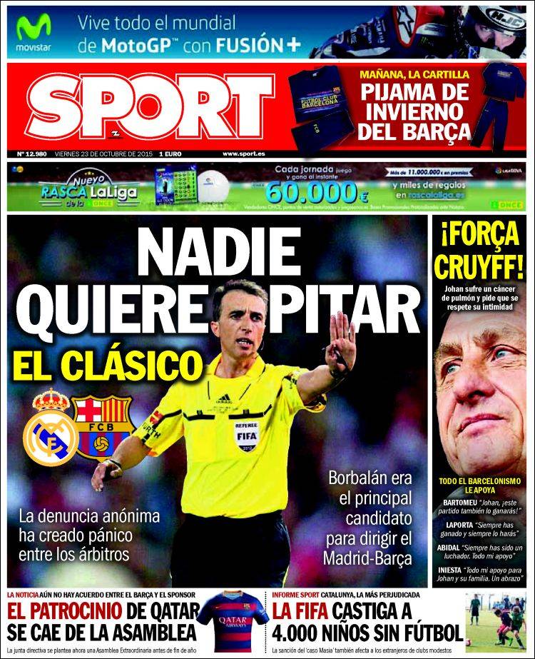 No obstante, ni siquiera la grave dolencia de El Flaco despeja la portada de Esportivo de malos humos. Los chicos de Mascaró prefieren anunciar que nadie se atreve ya a pitar el Clásico. Normal. A ver quién es el guapo. Resulta mucho más rentable enfundarse el pijama de invierno del Barcelona, taparse con la manta polar blaugrana y pasar la tarde viendo películas románticas frente a la chimenea. Cualquiera sale allí fuera a pitar una falta a Busquets con la que está cayendo. Aunque parezca increíble, la conspiraçio tiene más peso que Cruyff en la portada de Esportivo. Y es que uno no inventa yugos y flechas arbitrales todos los días.