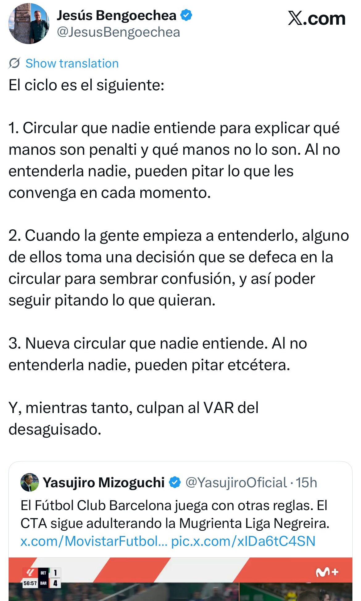 Cualquier neutral considerará que el planteamiento según el cual a nuestro equipo le preparan encerronas plenas de testosterona y permisividad arbitral, mientras al equipo cliente de Negreira le ponen la alfombra roja allá donde va, está demasiado sesgado por nuestro madridismo. Que cada uno opine lo que quiera. A nosotros nos parece indudable que el día en que el resto de equipos reciben al Madrid es su final de Champions de cada temporada (lo cual está bien, pues somos el Madrid) mientras el día en que ejercen de anfitriones del club cliente de Negreira es un partido más, en el mejor de los casos (lo cual está muy mal).