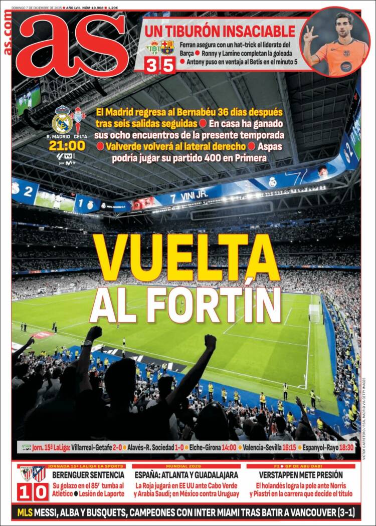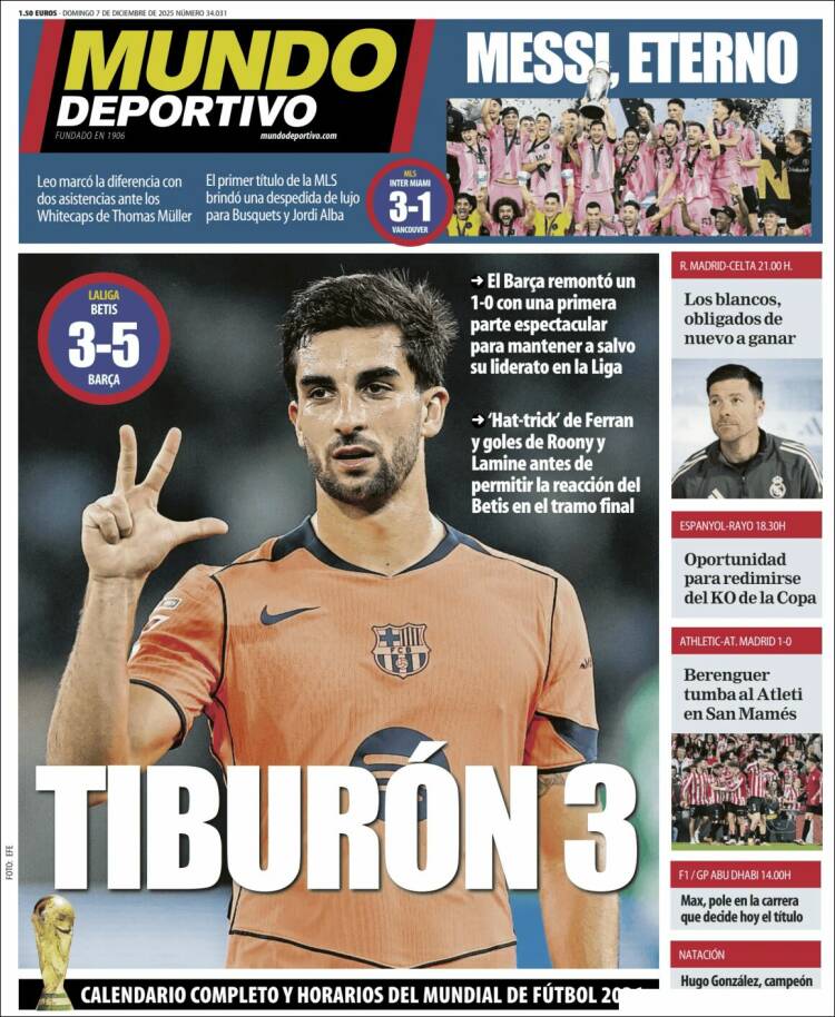 El hecho es que la prensa cataculé se muestra exultante con el Tiburón. Mundo Deportivo desempolva las referencias cinematográficas más boomer para reflejar en portada el triplete de Ferran.