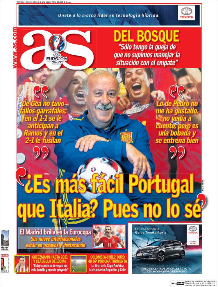 La portada-plasma del As no puede dejar más claro que Vicente del Bosque, ganador de dos copas de Europa con el a Real Madrid, está más sólo que la una tal vez muchos madridistas, entre los que me incluyo hayamos sido mezquinos con él, y espero que acuda con los veteranos de mi equipo, siempre.