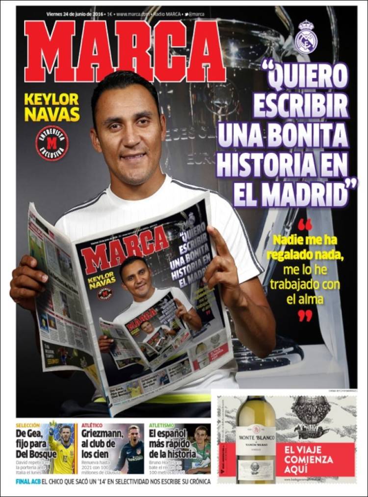 Centrémonos en cualquier caso en la beatífica figura de Keylor Navas en portada, cuya solo presencia inspira paz al explorador y ofrece calma al aventurero. Lo hace, incluso, aunque protagonice la portada de Marca leyendo el Marca en cuya portada aparece Keylor leyendo otro Marca, en lo que podría considerarse un "pequeño" exceso de The Hernia Chronicle. Los titulares escogidos para ilustrar la entrevista al costarricense tal vez sean recurrentes y tópicos, y más cuando en la entrevista asegura el tico, entre otros asuntos, y a buen entendedor pocas palabras bastan, que su relación con Kiko Casilla y el tercer portero del Real Madrid durante esta temporada, Rubén, ha sido mucho mejor que con Iker Casillas. Claro, que es tiempo de Eurocopa y no conviene perturbar al equipo en la portada de Marca.