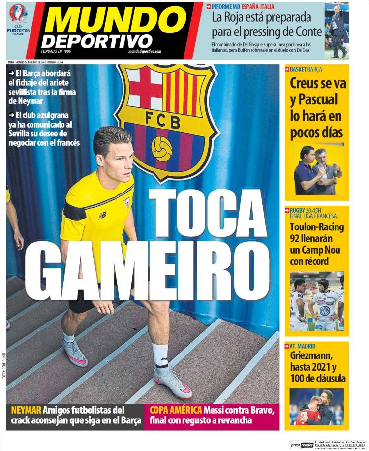 Mundo Deportivo no merece mayor comentario, salvo el olor que comienza a desprender el bueno de Gameiro, presunto fichaje de relumbrón veraniego que sin embargo huele ya a pescado en salazón. Curioso nos parece que ninguna de las cabeceras deportivas catalanas comente nada sobre el de los 57 millones y punto.