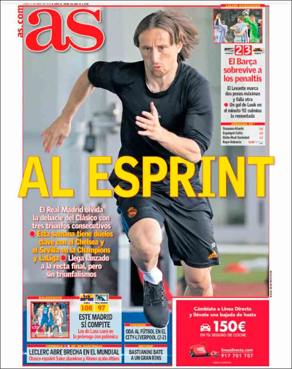As al burbujeo escrotal lo llama “Al esprint”, y lo ejemplifica en la imagen de Luka Modric entrenando duro para el choque contra los de Tuchel. No nos parece mal, son distintos modos de designar lo mismo. Tras resolver con tres victorias importantísimas la zozobra causada por el Clásico, “llega lanzado a la recta final pero sin triunfalismos”. Ese equilibrio resulta fundamental. Creer que eres capaz de pintar la cara de cualquiera de cualquier color, pero atesorando las dosis suficientes de cautela que da el saber que cualquiera te la puede pintar a ti, y de cualquier color también.