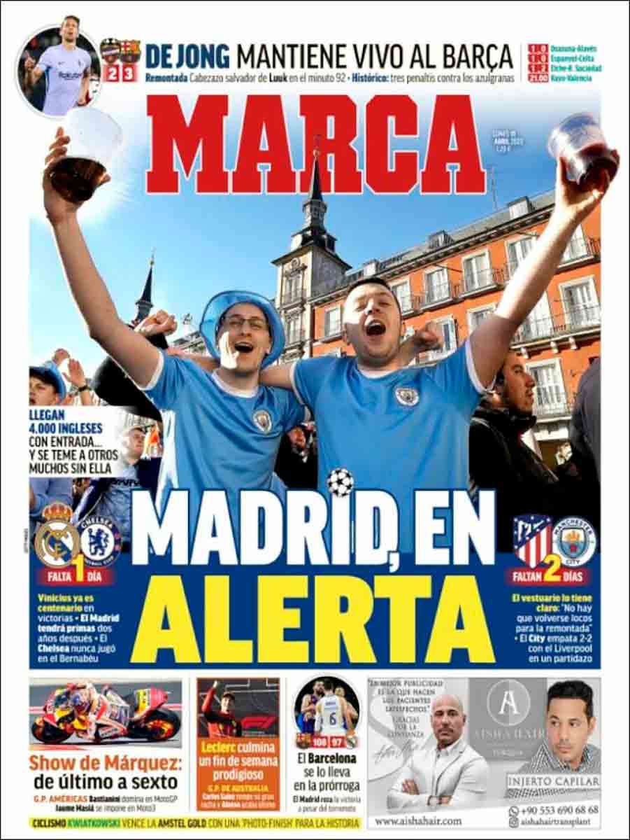 Marca se centra en el componente, digamos, sociológico de la visita de los dos equipos ingleses (Chelsea y City) a la capital española en estos días. Cada vez que una hinchada potencialmente violenta toma la capital, la prensa se escandaliza ante su mera existencia, y alerta sobre lo peor. Nos parece muy bien, pero nos choca que esta alarma no vaya de la mano con un elogio al Real Madrid (y por supuesto también al Barça) por el modo ejemplar en que han erradicado la violencia de sus gradas y han dejado de financiar los desplazamientos de grupos de ultras conflictivos. También nos choca que desde la prensa patria no se exija jamás al Atlético de Madrid que imite lo que ya hicieron Florentino y Laporta, máxime cuando sus ultras, neonazis de manual, tienen delitos de sangre en su siniestro historial. No hay coherencia en mirar con recelo a los hooligans de City o Chelsea mientras se normaliza al Frente Atlético.