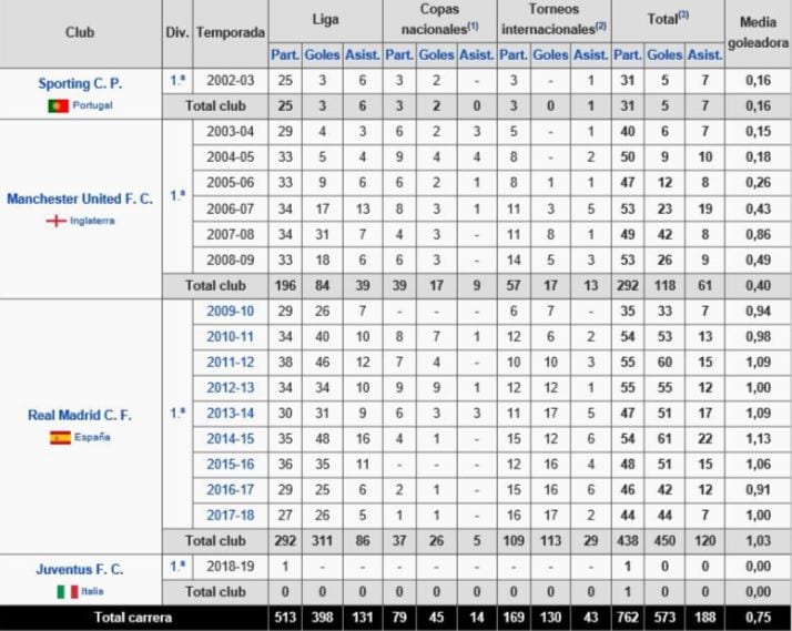 En ninguno de estos dos cuadros se recogen los números con su actual club, la Juventus. En este segundo cuadro faltan los números con la selección de Portugal, cuestión que resulta intrascendente para lo que yo persigo.