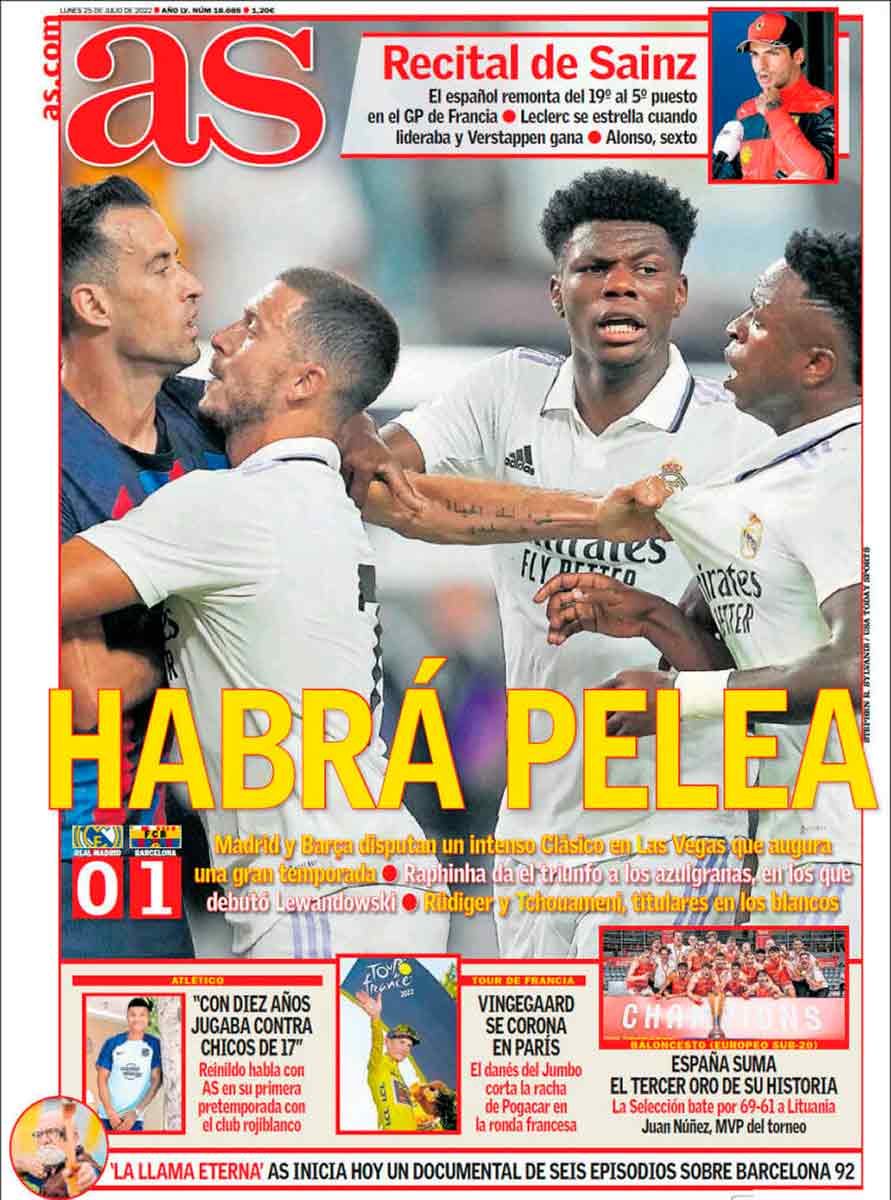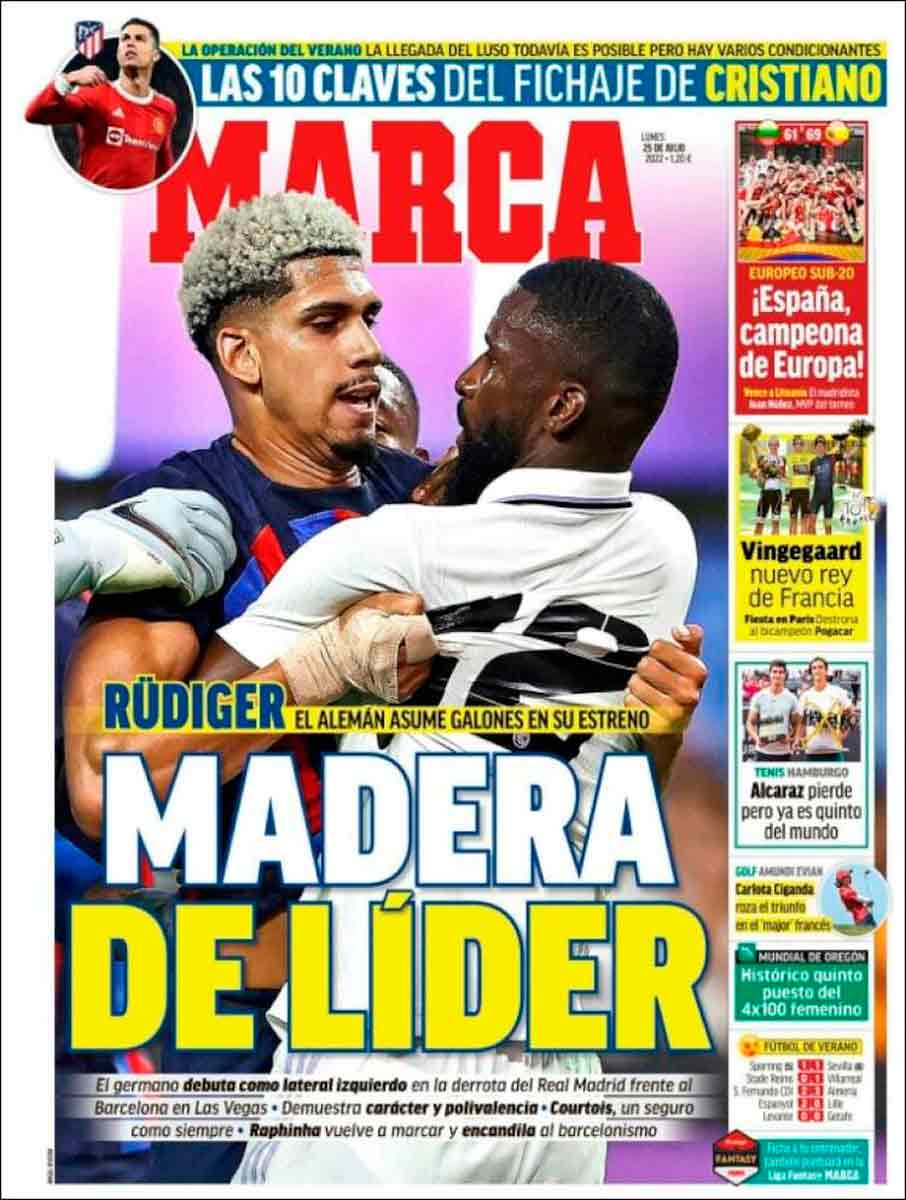 Marca dedica su frontispicio a Rüdiger, que pugna en la fotografía con Araújo a causa de una de las tanganas del partido provocadas por las entradas violentas azulgranas. “Madera de líder” dicen que tiene el alemán. Es cierto que dejó buenas sensaciones, pese a no jugar en una posición habitual para él. Todo apunta a que el bueno de Antonio nos va a dar muchas alegrías.