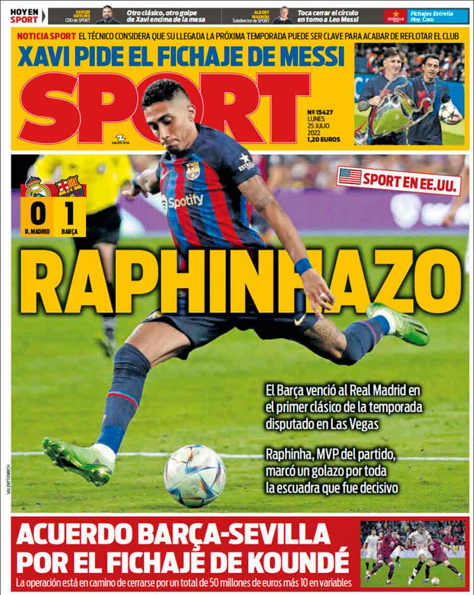 También es característico de su ADN almacenar solo ciertos fragmentos de la realidad. En la franja superior de Sport podemos leer a Xavier Ortuño: “Otro clásico, otro golpe en la mesa de Xavi”. Queridos culés, desde que está Xavi, el único clásico con relevancia inmediata para ganar un título fue el de la Supercopa de España y lo perdió el Barça. Pero debido a ese borrado selectivo de memoria que padecen los barcelonistas, ha dejado de existir. Solo existen el 0-4 y este último 0-1 en Las Vegas.