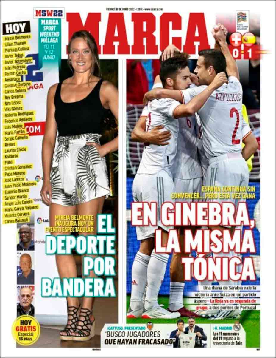 Donde las das las toman (con perdón), Lucho. Bien es cierto que la propia competición es bromuro puro, perfecto antídoto contra la lujuria. Ya decimos que nadie tiene la menor idea de qué es eso de la Nations League, aunque sí intuimos que se trata de algo tan aburrido como para que no pueda pasarse el trago sin empujar con un buen gin-tonic. Que le pregunten al portadista de Marca, que en la eterna disyuntiva juvenil entre alcohol y amor parece tenerlo claro, incluso a pesar de estar flanqueado por la belleza de Mireia Belmonte.