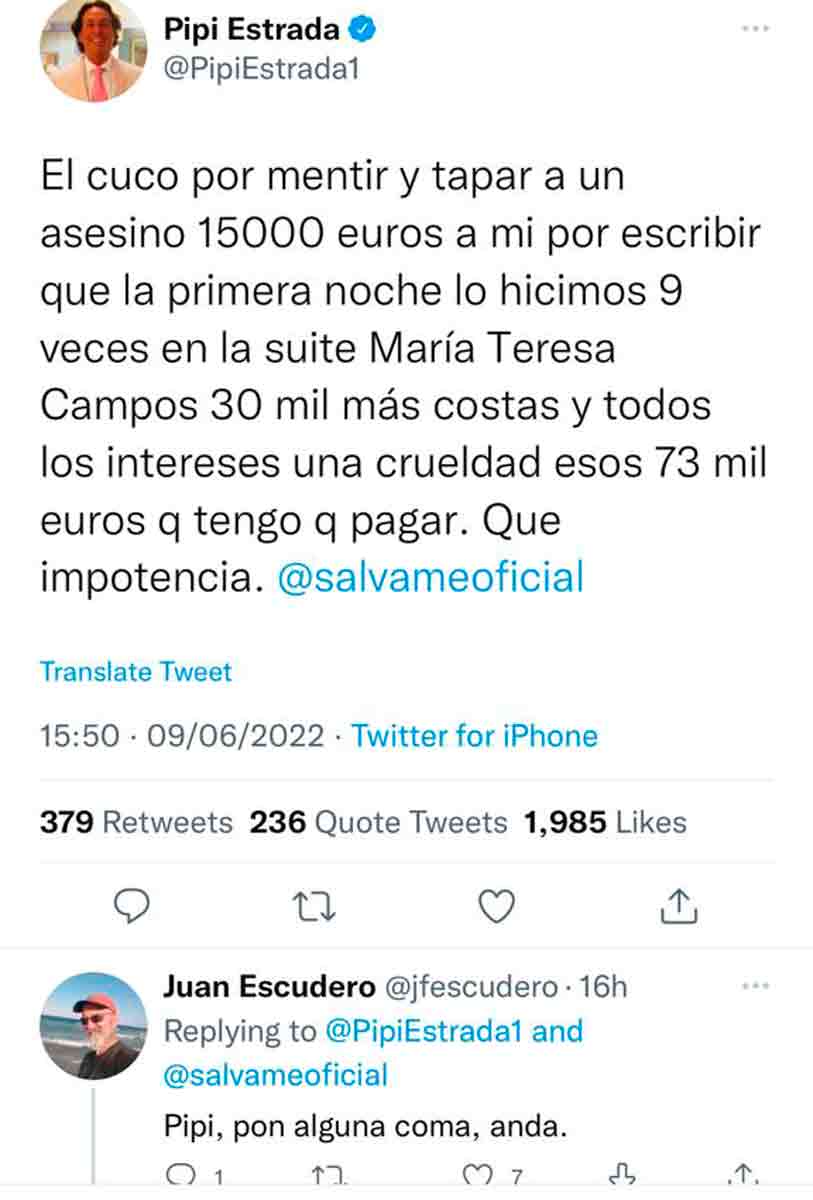 Lo cierto es que no tenemos ni idea de a qué vienen las diferentes cantidades monetarias a las que se refiere Pipi, ni cuál exactamente es el motivo de su queja. Bástenos con saber que lo ha hecho nueve veces en una noche, en la suite Marí Teresa Campos de no sé qué hotel o donde sea, y que semejante manifestación de ardor nos viene pintiparada para ejemplificar el grado de desenvolvimiento de la lascivia en estas fecha veraniegas. Bien es cierto que no acertamos a desentrañar la contradicción a través de la cual un tuit que habla de hacerlo 9 veces concluye con un amargo "Qué impotencia", pero en fin. (También nos gusta la petición de nuestro colaborador Juan Escudero en respuesta al tuit, aunque esta la haya realizado Juan más movido por el amor a la sintaxis que por ningún afán concupiscente).