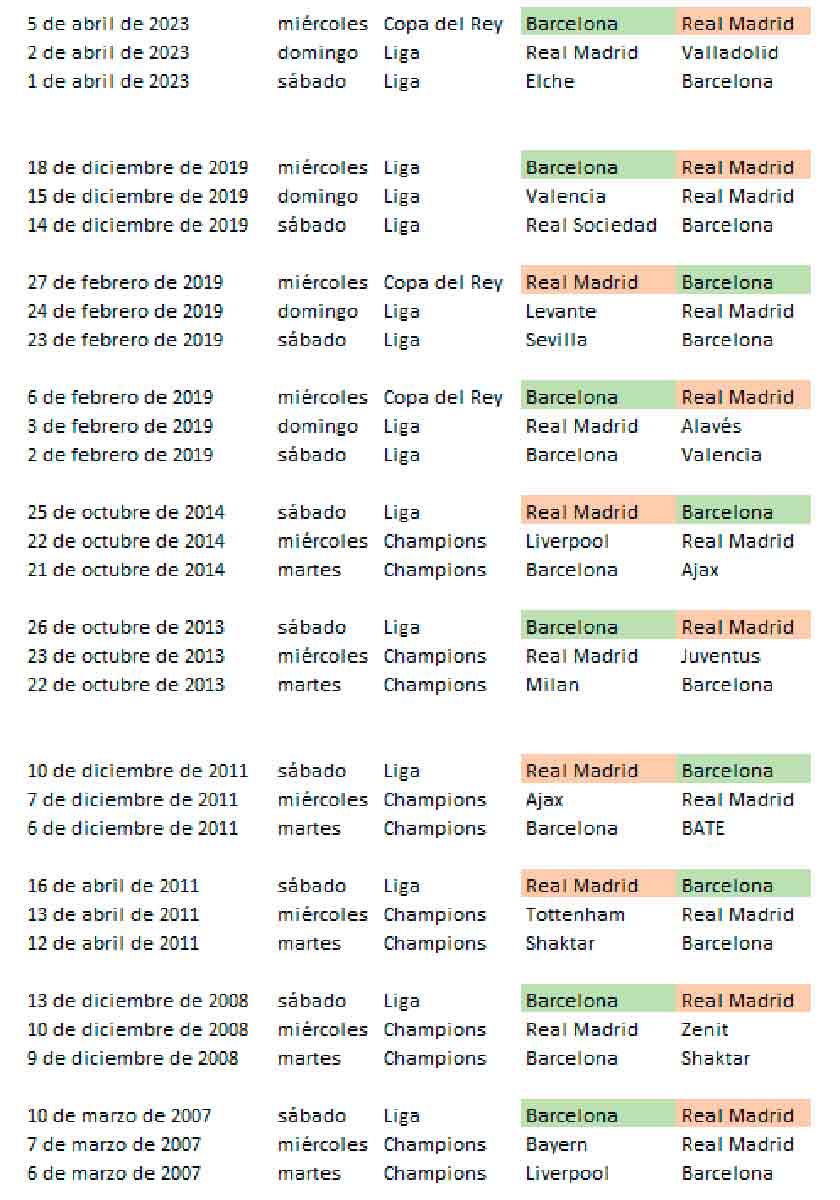 Brutal, menuda estadística. Hubo una vez en que el calendario nos favorecía, una sola. Era el Clásico del Camp Nou del 26 de octubre de 2019, donde el Madrid contaba con un día más de descanso que el Barça. ¿Qué ocurrió? Pues que se aplazó por los incidentes que hubo en Barcelona tras el 1-O de ese año y al final se llevó al 18 de diciembre (figura en el cuadro): para el Barça, 4 días después de jugar en Anoeta y para el Madrid, 3 después de hacerlo en Mestalla. Qué casualidad. Y con HH en el campo y BB en el VAR. Pero no nos podemos quejar y esas cosas.