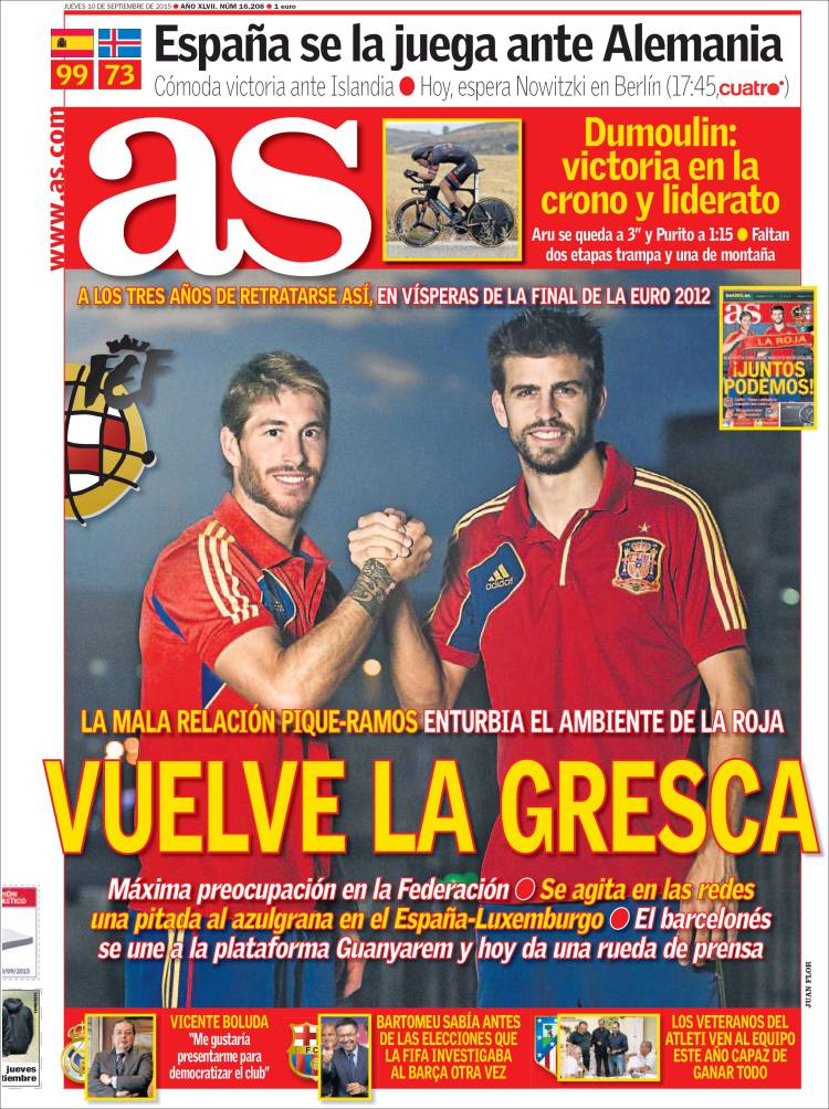 "La mala relación Piqué-Ramos enturbia el ambiente de la Roja". Repetimos, por si no se ha entendido bien: lo que enturbia el ambiente de la "Roja" (pggjjjjj) es la mala relación (!!) de Piqué y Ramos. Ya lo veis: es un asunto de pura falta de sintonía personal entre ambos centrales, con igualdad de deméritos entre ambos.