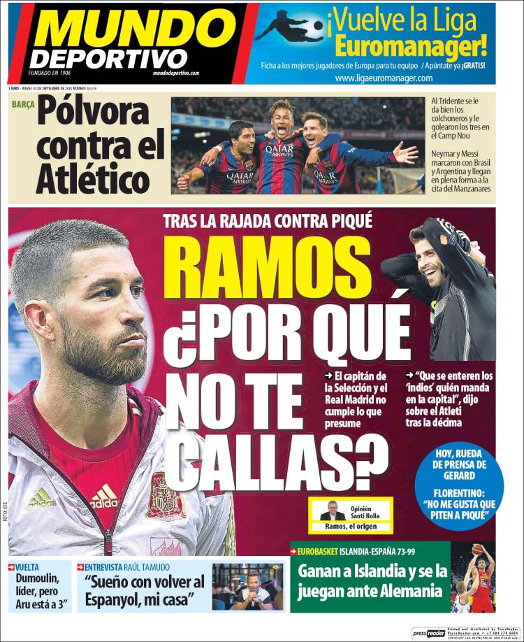 1. Sergio Ramos no se calla porque el que tiene que callarse es Piqué, a quien que se sepa jamás habéis llamado la atención de modo tan desabrido y ni mucho menos en portada, Mundo Deportivo, caballero infatigable en defensa de los más acerados valors: ni cuando escupió sobre la coronilla de un directivo de la Federación Española de Fútbol, ni cuando grotescamente sacó a pasear la manita tras un 5-0 al Madrid, ni cuando públicamente se permitió mofarse de la vida privada de un jugador del Madrid en una celebración azulgrana, ni cuando opinó de forma desatinada sobre las finanzas del Real Madrid, ni cuando se mostró comprensivo con la ofensa pública de miles de personas hacia unos símbolos nacionales (españoles o de donde fueran, eso no importa). En ninguna de esas ocasiones -o en otras muchas que podríamos sacar a colación- hicisteis una portada como esta, que es precisamente una de las razones por las que Sergio Ramos se ve obligado a salir en defensa del Madrid: porque ni tú ni (esto es más triste) ninguno de tus colegas madrileños vais a darle nunca a Piqué la portada que merece. (Lo que acabamos de reseñar respecto a los diarios madrileños lo atestiguareis de nuevo si llegáis al final de esta sección).