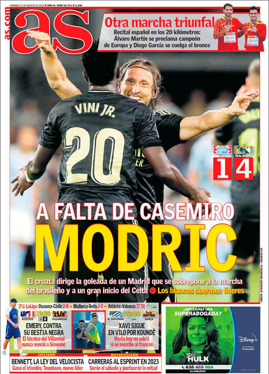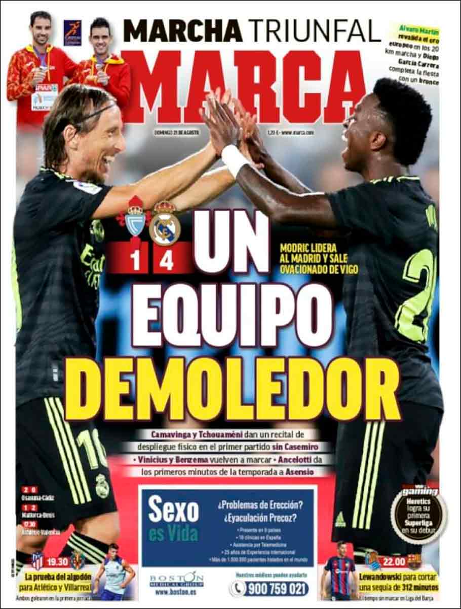 “Un equipo demoledor”, titula Marca, y nos gusta más, aunque no resistamos la tentación, en la línea puntillosa que nos caracteriza, de enmendar la plana al destacado “Camavinga y Tchouaméni dan un recital de despliegue físico en el primer partido sin Casemiro”. No solo de despliegue físico, amigos de Marca. Son dos chicos que imponen por su energía y tremenda presencia física, pero que también juegan el balón como les da la gana. Su recital fue tan físico como técnico o táctico. Este era un partido muy importante para el futuro del equipo, mucho más de lo que a priori sugiere un simple Celta-Real Madrid de la jornada dos. Era una ocasión propicia para demostrar que esta escuadra, y en particular los centrocampistas nuevos, tienen la personalidad y el juego para superar con suficiencia el trauma de la marcha de Carlos Henrique. Queda muchísimo por remar, pero esta primera prueba está superada.