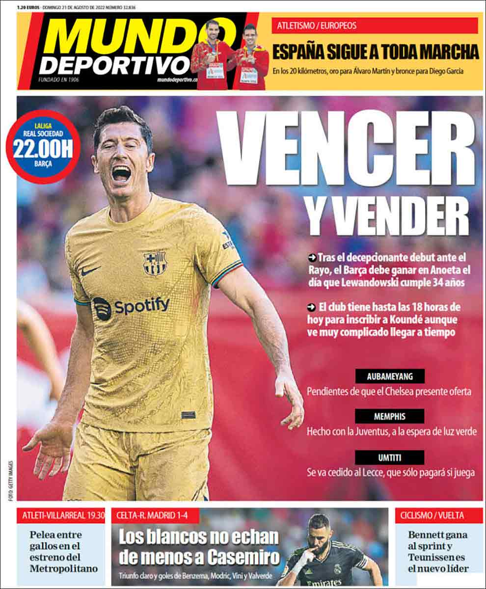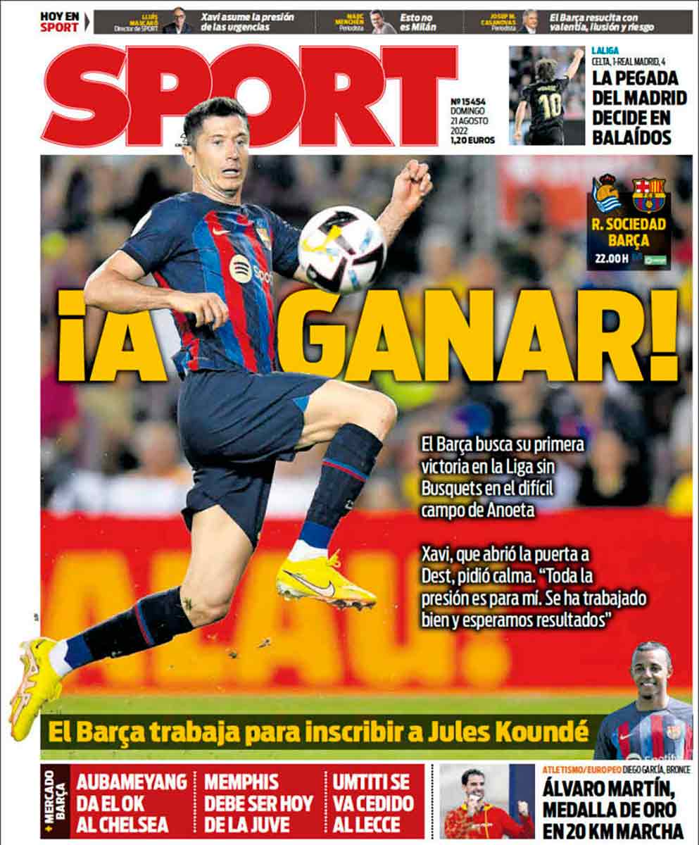 El Barça, por lo demás, juega esta noche en Anoeta, y la portada de Sport ya no sabe a qué sutilezas recurrir para suplicar a los de Xavi que ganen, de manera que optan por un taxativo “¡A ganar!”. Cuando te llega el agua al cuello, y la presión de las palancas te ahoga, no hay mucho lugar para el refinamiento, aunque sí lo haya para el topicazo cuasi-faltón: “La pegada del Madrid decide en Balaídos”. ¡La pegada de los atletas! Hay estereotipos que nunca deberían pasar de moda ni pasar a ser verdad.