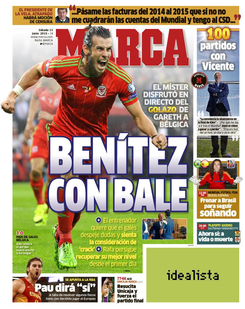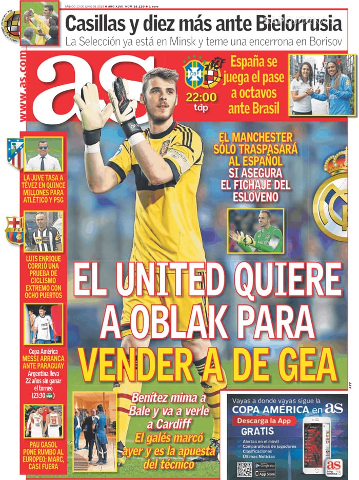 También As habla del encuentro entre Benítez y Bale en Cardiff, pero no lo asume como el tema principal del día. El centro de su portada es, para variar, una enorme novedad novedosa: el asunto de la portería del Madrid. Dice As que De Gea vendrá al Bernabéu si Oblak se va al Manchester, o al menos esa es la condición que parece pedir el club de Old Trafford. Pero tranquilo, Iker. Nosotros en As informamos de estas cosas porque el mercado lo pide, porque el mundo sigue girando, mal que nos pese, pero tú eres la niña de nuestros ojos. De ahí que ante Bielorrusia (partido en la cumbre), "Casillas y diez más". Porque sin ti qué somos, Iker. Sin tu siempre templada presencia, solo somos "diez más", apenas una masa informe de jugadores vestidos todos iguales y, por tanto, irreconocibles si tu santidad no les arroja luz discernidora. Bueno, es verdad que en el anterior partido ante Costa Rica -donde al parecer jugó no del todo mal un tal Keylor Navas- Casillas estuvo todo el partido en el banquillo, y es verdad que tal vez por eso juegue esta vez Iker contra Bielorrusia, pero "Casillas y diez más", coño ya, con emocionada lágrima en un ojo si hace falta.