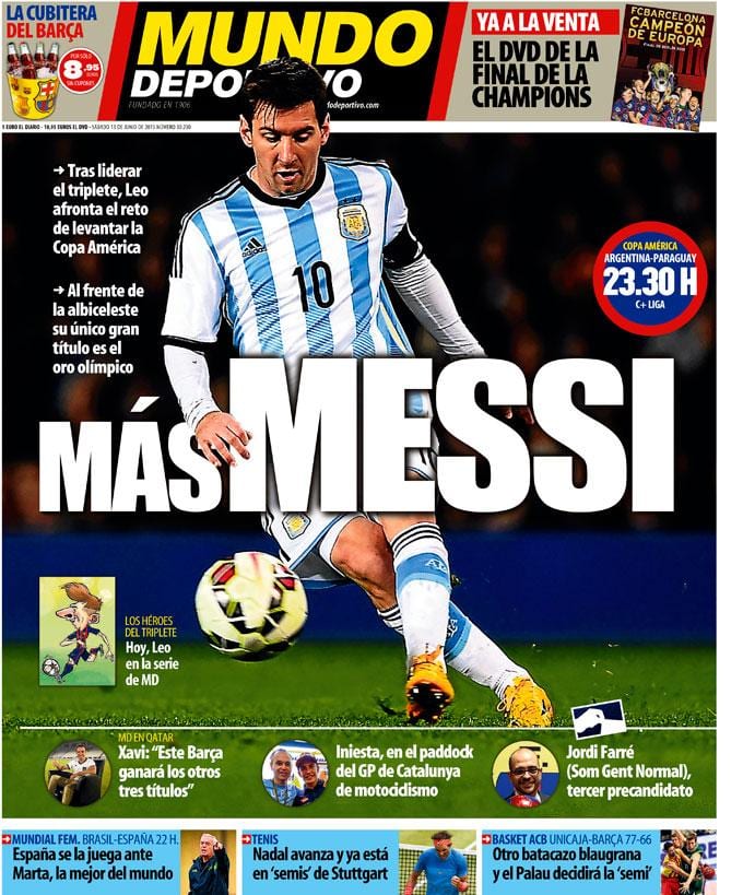 Saben bien en Mundo Deportivo que el Barcelona es més que un club, y tal vez a ese més solo le falten dos letras -otra s y una i- para ser completado. De ahí que, Barcelona aparte, el Diario de la Cubitera esté bien pendiente del debut del argentino en la Copa América, aunque solo sea porque -como admite el mismo periódico- "al frente de la albiceleste su único gran título es el oro olímpico". Poca cosa parece para el mejor jugador de la historia universal de todos los tiempos hasta el infinito y más allá. Así que echemos abundante hielo en la cubitera y brindemos por el éxito de Messi en la competición veraniega. Al menos este año pareció no reservar fuerzas durante la liga para estar a punto con su selección, y eso Mundo Deportivo sabe agradecerlo, genuflexión mediante.