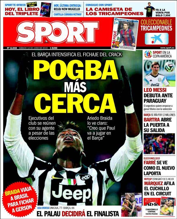 Y en Sport, justo debajo del libro del triplete, el reloj New Mugello (me lo quitan de las manos), la cámara Netway, la camiseta de los tricampeones (bueno, bonito, barato), el coleccionable de los ídem y venga, señora, que estamos que lo tiramos; justo debajo del mercadillo, "Pogba más cerca". Normal. Una vez renovado Dani Alves -los estilistas españoles lo agradecen, al ser fuente inagotable de inspiración- lo de Pogba debe de ser sencillo. Ambos intimaron en la final de Champions con el árbitro como celestina, y una final de Champions une mucho, sobre todo si el affaire es dentro del área, en más que posible penalti y apenas unos segundos antes de ponérsele de cara el partido al Barcelona. Nos parece muy lógico que, con estos condicionantes, Pogba se haya quedado prendado de las artes de Alves y del estilo culé, sea el que sea.