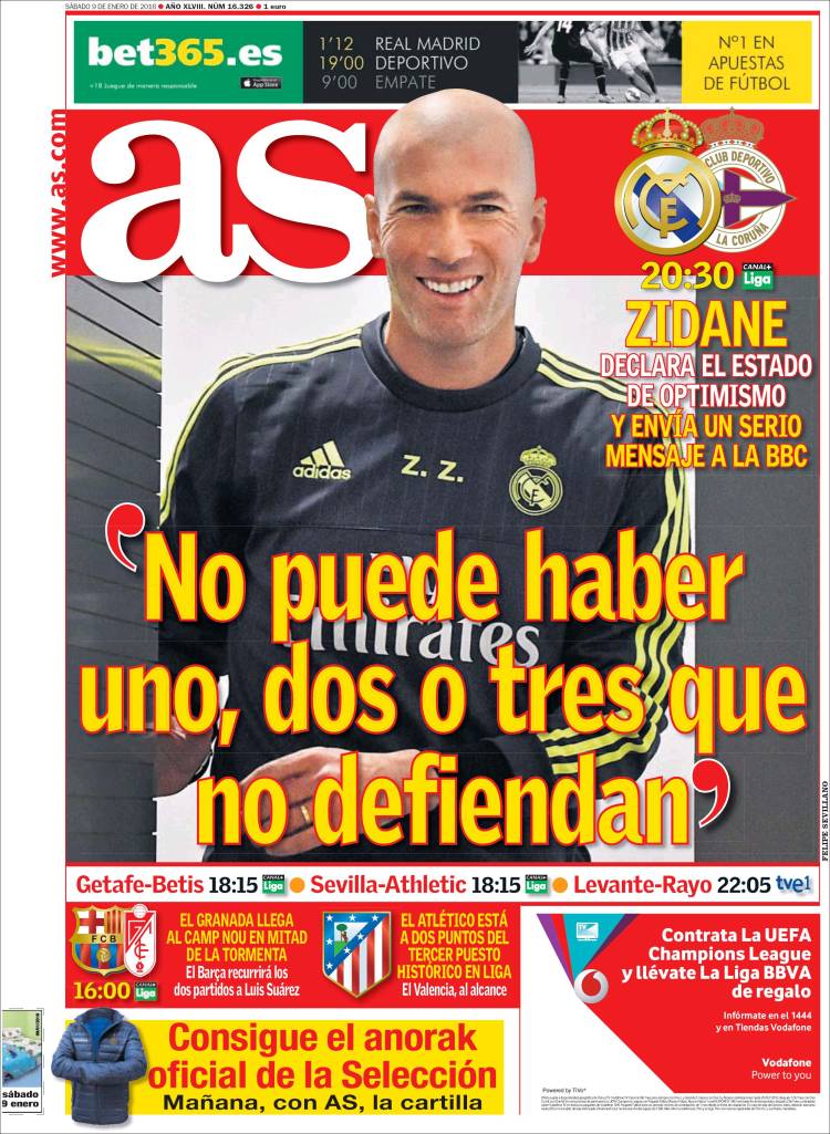 Así que metamos un zasca a la BBC por si las moscas, aprovechando que el Pisuerga vuelve a pasar por el Bernabéu. Pongamos una pletórica sonrisa de Zizou en portada mientras le congelamos el apacible gesto con un "pero" marca de la casa al que añadimos el adjetivo "serio". Toma contraste, querido lector de traje gris. No sueñes, querido turista accidental. Abandona toda esperanza.