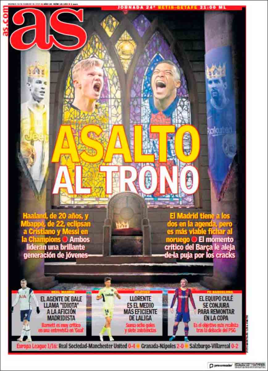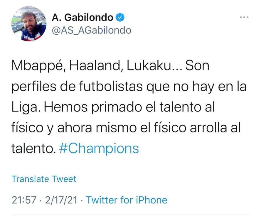 Claro que la horterada pseudomedieval que perpetra hoy As tampoco se queda atrás. Solo faltan por ahí los caballeros de la mesa cuadrada de Monty Python. La irrupción imparable de Mbappé y Haaland está teniendo una digestión regulera por parte de la prensa patria, sobre todo en combinación con el pésimo papel que de momento está desempeñando el fútbol español en la Champions, con el Sevilla sucumbiendo ante el Dortmund y el Barça siendo vapuleado por Mbappé y sus compañeros. Lo del Barça no podrá objetar la prensa patria que les ha pillado por sorpresa. La vejación ante el PSG es la quinta en cinco años consecutivos, repetimos: 3-0 en Turín, 3-0 en Roma, 4-0 en Liverpool, 2-8 en Lisboa y ahora 1-4 ante los del jeque catarí que te vi. Ha sido una decadencia largamente anunciada, sobre todo la del Barça, y sin embargo a los medios hispanos parece hacérseles aún muy difícil de encajar. La decadencia del Barça y la de la propia Liga de Tebas. Ved si no el elocuente tuit de Gabilondo. Están los pobres periodistas como un boxeador noqueado.
