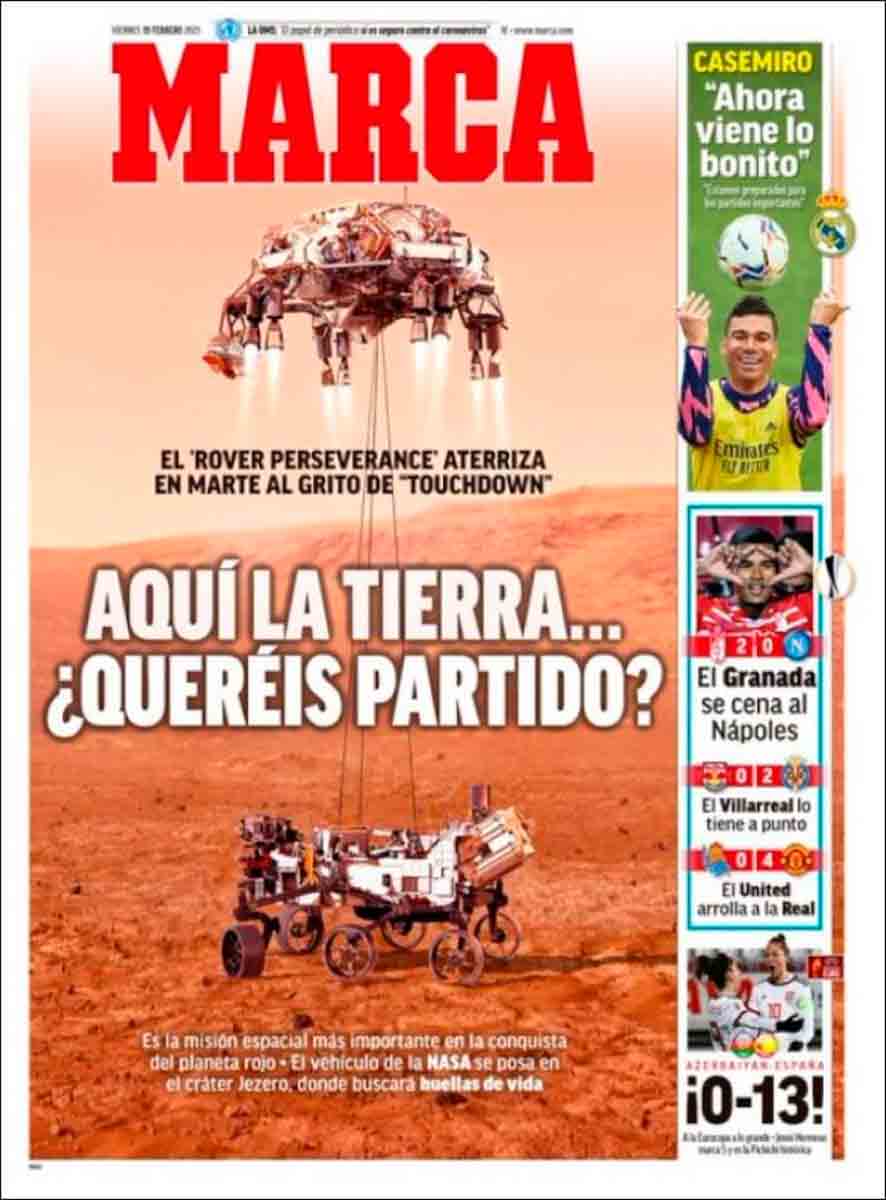 Tan insustanciales son las noticias del día que Marca opta por hacer tic en la modalidad portada arriesgada. Este tic les sale bien a veces, si bien hoy es un intento fallido y la cosa queda un poco raruna. El Rober Perseverance aterriza en Marte al grito de “Touchdown” y el lector tarda un rato en captar la gracia de la pregunta principal de la portada. Cuando la capta, se pregunta si valió la pena el esfuerzo. Pero vamos a salvar la portada de la quema porque la audacia es siempre un bonus point, sobre todo cuando no hay mucho donde rascar. Menos mal que Casemiro aparece a la derecha, con unas declaraciones pelín insustanciales, eso sí. ¿Por qué, en lugar de citar sus palabras con poca chicha, no contar que la razón por la cual Casemiro fue noticia ayer fue la concesión de EFE como el mejor jugador iberoamericano en 2020? No comprendemos y, como no comprendemos y no estamos para no comprender a las 6:31 de la mañana, la portada que habíamos salvado de la quema al final la vamos a lanzar a la hoguera, otro día será, Juancho.