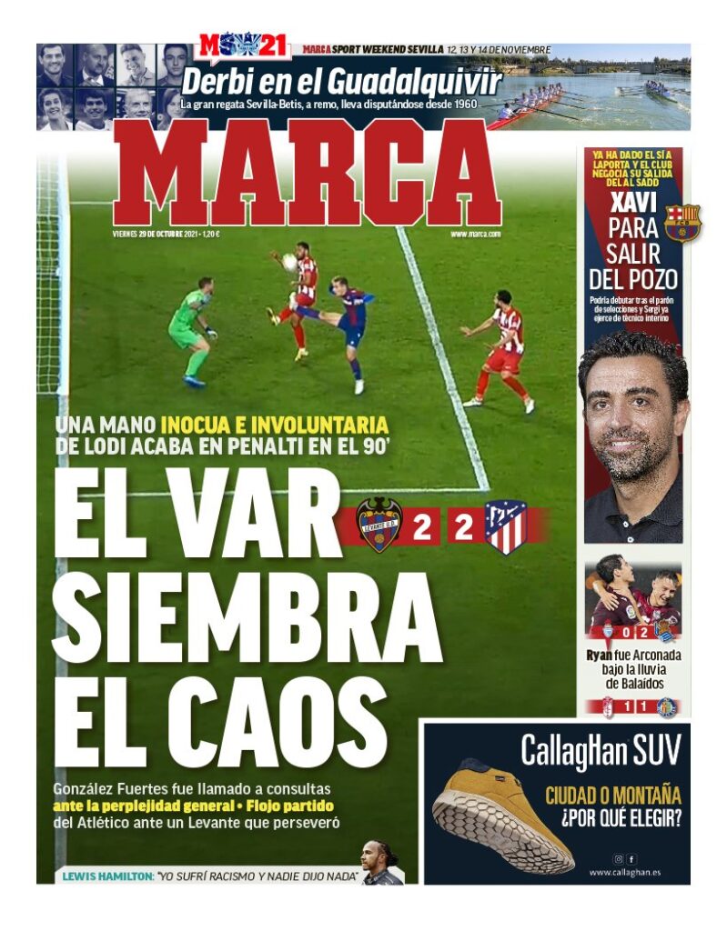 Sobre el penalti en cuestión (el segundo, no el grosero de Lucho) se escribirán libros -el primer prólogo del primer libro es esta portada-. Se dirá, probablemente con razón, que el reglamento tal como está es una chusta. Lo que no admite discusión -y si no pregunten a nuestro Alberto Cosín- es que eso es penalti con el reglamento en la mano, y que el VAR hace bien en llamar la atención del árbitro de campo para que observe las imágenes en el monitor. Parece ser que esta actuación del VAR es la que empuja a Marca a calificar con el término “caos” lo que el VAR sembró o siembra, dado que Marca lo expresa en presente dando la idea de un continuo. “El VAR siembra el caos”.