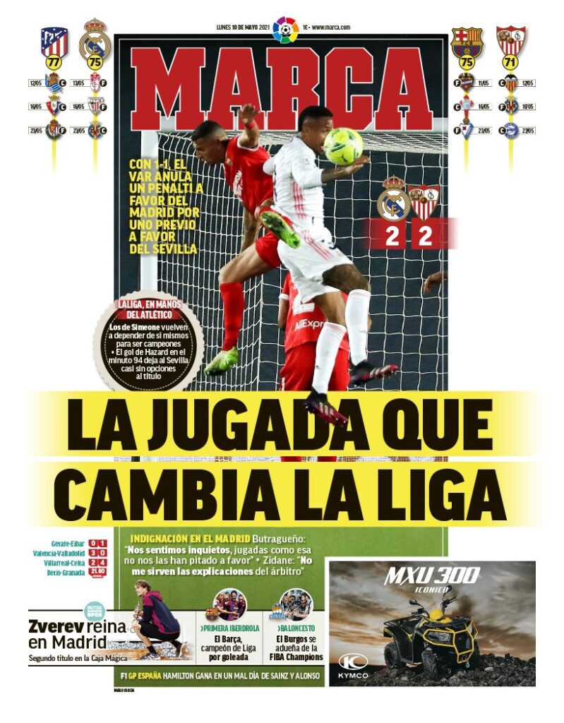 En un cosa damos la razón a la portada de Marca del 10 de mayo de 2021: la jugada cambió la Liga. Esa y muchas otras, pero esa en particular. Sin embargo, echamos de menos el chaos en este backyard, por seguir con Sir Paul. Aquí no hubo “caos”, amigos. Tan solo hubo una exposición fría, quirúrgica, aséptica, desprovista de valoración alguna sobre la justicia o injusticia del tema: “la jugada que cambia la Liga”. ¿Para bien o para mal? No lo sabemos. Marca aquí no se pronunció. Se ahorró cualquier palabra que encierre un juicio de valor, como le sucede a “caos”. Escándalo cuando el perjudicado es el cholismo. Mera enunciación de la relevancia de la jugada (“cambia la Liga”) cuando el perjudicado es el Madrid.
