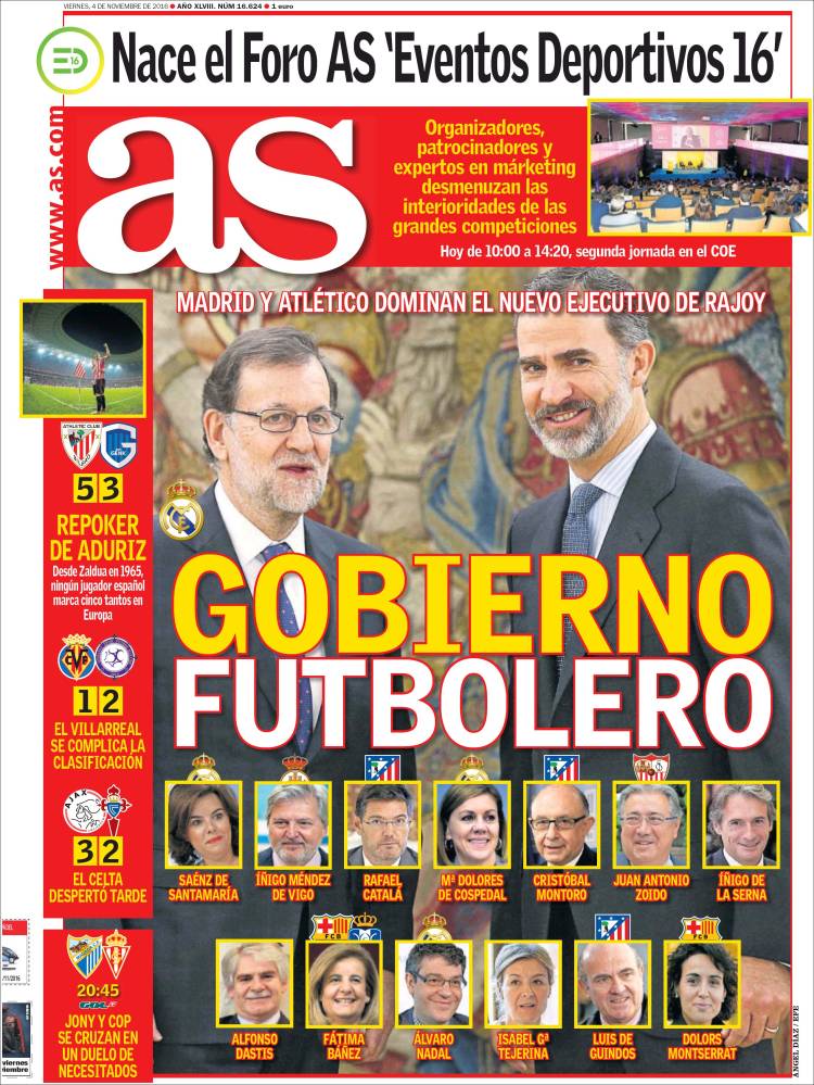 Caras también -va sin segundas- las que trae a su portada The Ouija Daily. España ya tiene gobierno, donde predomina (dice As) el dominio del Madrid y del Atleti. Que la nueva ministra de Defensa, por ejemplo, no sea del Atleti es algo que clama al cielo, pero que sí lo sea el ministro Catalá viene a demostrar la pinza antimadridista tradicionalmente practicada entre los colchoneros y los poderes fácticos del pequeño país de ahí arriba (el AntiMadrid FC). También es del Atleti Montoro, y no deja de tener su gracia que el señor que gestiona la deuda de todos los españoles (en particular de algunos con el pelo amarillo fosforito) con Hacienda sea de un equipo a quien el fútbol debe tanto. Le pone Relaño el escudo del Madrid bien grande al presidente Rajoy para que quede claro cómo nos luce (?) este hecho en el campeonato nacional, pero olvida (?) situar el rojiblanco sobre la cara del monarca. El rey, señores, es bien sabido, es del equipo del pueblo, para que luego digan que la institución no está debidamente enraizada en la sociedad nacional. Inquietante.