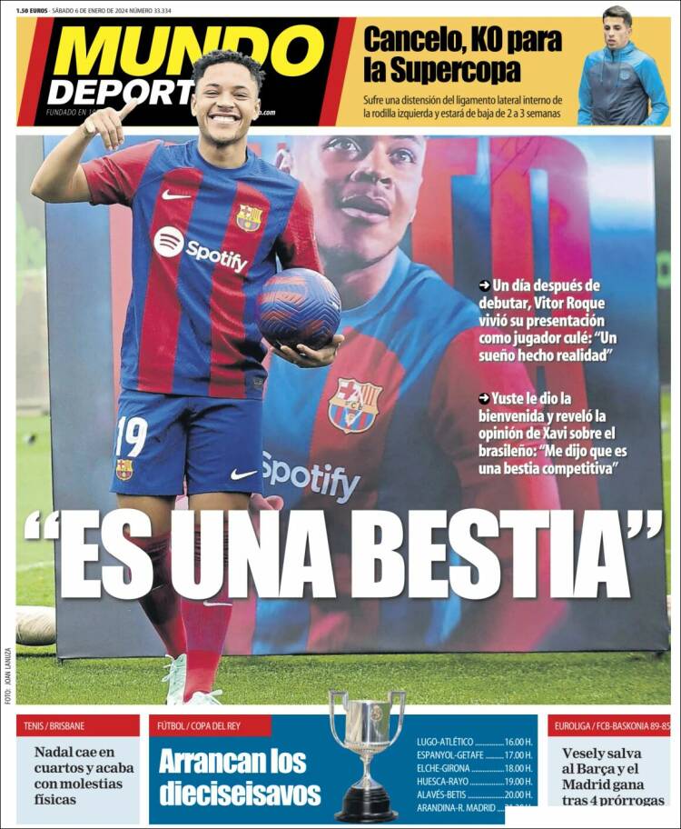 Por increíble que parezca, tamaña gesta no aparece más que de refilón en las portadas del día, que os dejamos por aquí. Ya sabéis que esta noche juegan los de Ancelotti ante la Arandina en partido de Copa. La ilusión del equipo castellanoleonés es el argumento central de las portadas de Marca y As. Nos alegramos mucho de que les haga ilusión, lo que por supuesto no implica que a nosotros no nos haga ilusión eliminarlos. Parece que debutará Güler. El partido es a vida o muerte en un campo que no estará en condiciones. Esperamos pasar y no lesionarnos. Os lo contaremos todo aquí, por supuesto.