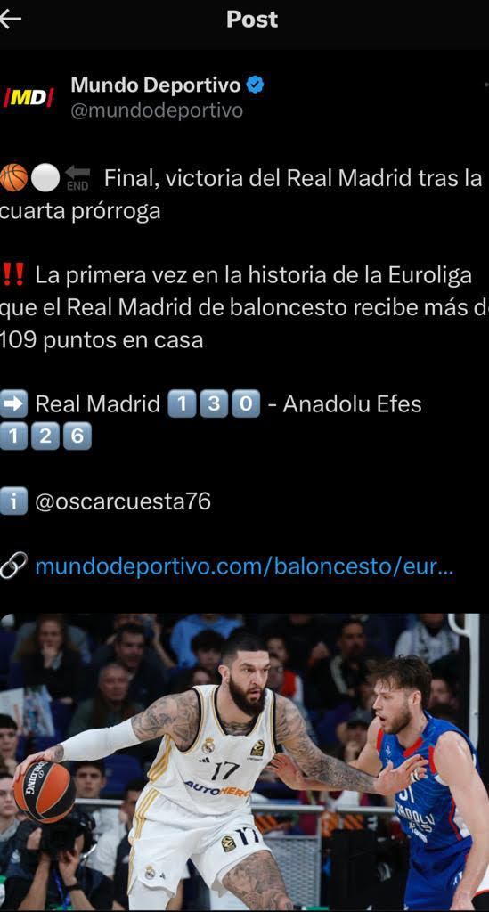 El otro gran saco de carbón de la mañana de Reyes llegó a nombre de Mundo Deportivo, o más específicamente de su community manager de twitter, X o como se llame ahora. Sabréis que el Real Madrid venció al Efes en un partido absolutamente histórico (130-126) después de ¡¡cuatro!! prórrogas, algo sin precedentes en la historia de la Euroliga. Lo borraron en cuanto se dieron cuenta de su propia ridiculez y mezquindad, pero ved lo que el CM de Mundo Deportivo destacaba al respecto.