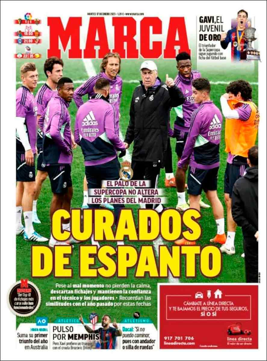 Marca viene con la típica foto de Ancelotti dirigiendo una sesión, con sus jugadores en corro, sobre la base de un titular algo críptico. “Curados de espanto”. A Ancelotti le diríamos hoy muchas cosas, por ejemplo esta: Carlo, atrévase. Haga cosas. Busque variantes que maximicen el rendimiento del equipo pese al valle físico. Sea creativo. Asuma riesgos. Por ejemplo, mire al Castilla, que no en vano es uno de los mejores de los últimos años y la sensación de su categoría. Si andamos tan justos de fuerzas, y si el calendario se presenta tan estremecedor como lo hace, quizá quepa dar entrada paulatina y puntual a chicos del filial en el once. Están rodados en medio de una temporada que para ellos está siendo normal, y pueden aportar.