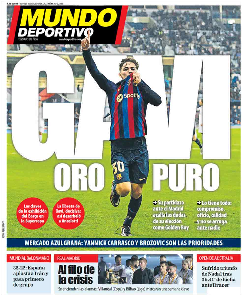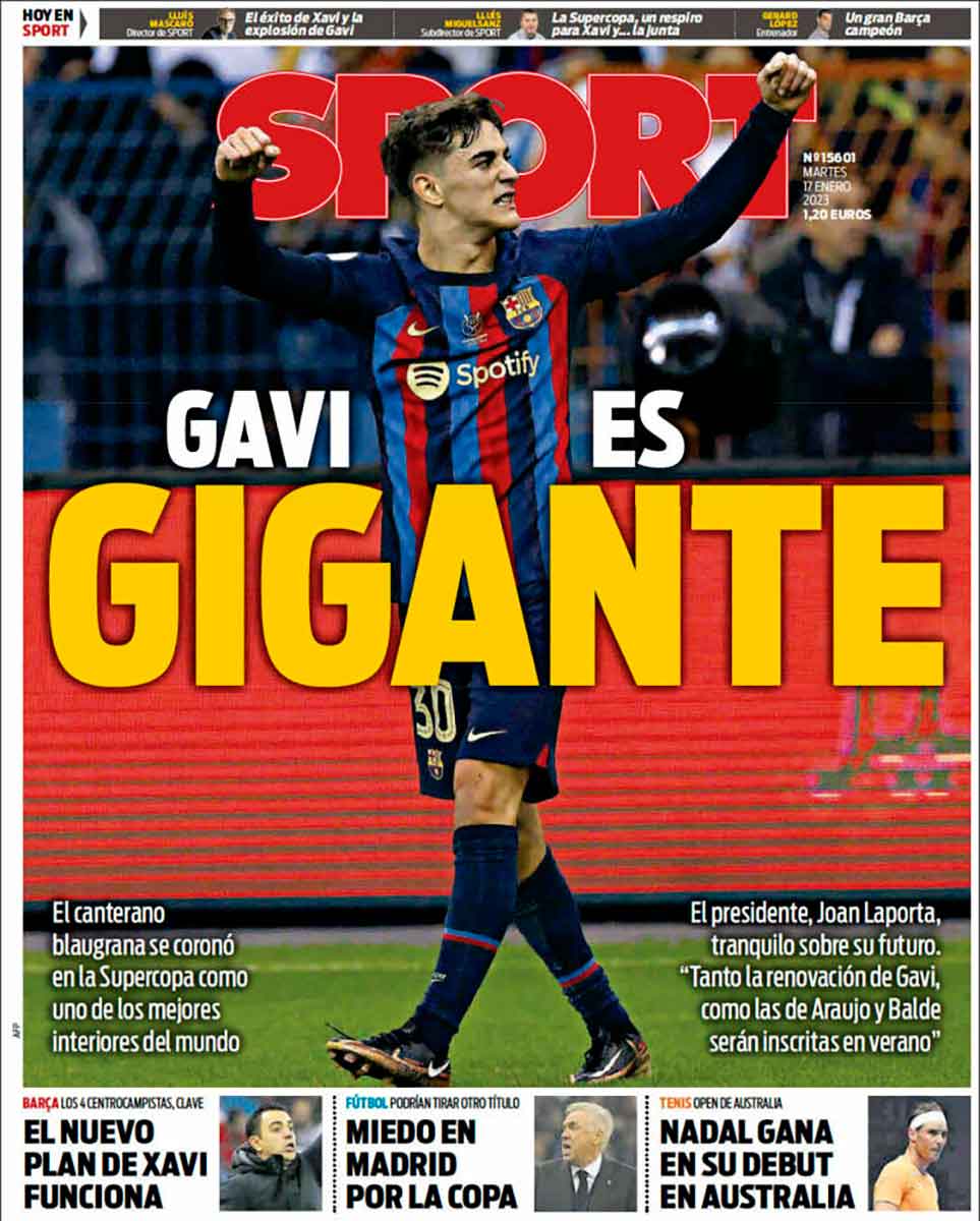Sport, instalado como su gemelo/competidor en la hipérbole más surrealista, afirma que Gavi, jugador que poco a poco se va afianzando pero que tiene muchísimo camino por recorrer, “se coronó en la Supercopa como uno de los mejores interiores del mundo”.