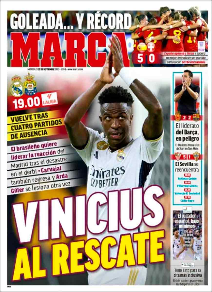 La risa va por barrios, amigos. Y el partido de esta noche tiene además el aliciente del retorno de Vinicius, a quien hemos echado de menos y a quien van dedicadas las dos primeras planas de la prensa deportiva madrileña. No sabemos si entre As y Marca hay topos que informan de los titulares ideados por las respectivas redacciones de ambos rotativos, pero cualquiera diría que sí, o que la desidia creativa en ambas instancias es tan notoria que coinciden en el lugar común.