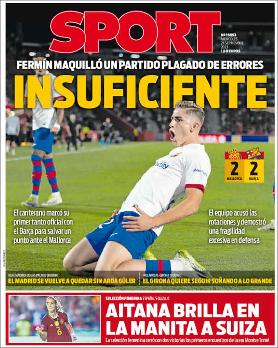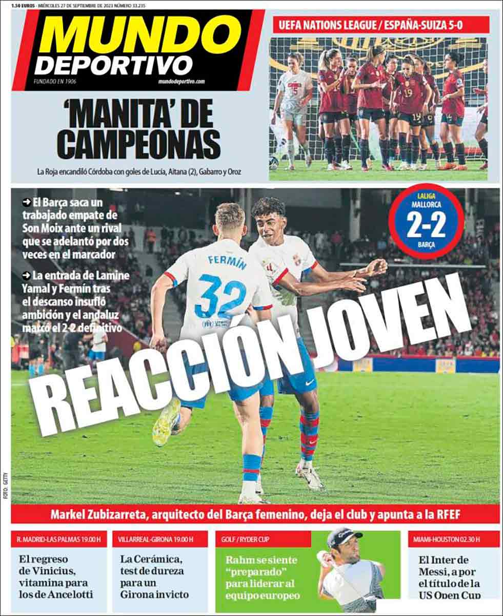 Como notaréis, Mundo Deportivo parece más satisfecho con la “reacción joven” que Sport con el “insuficiente” empate. Nosotros (pero qué sabremos nosotros) estamos más en la línea de considerar que un empate en Mallorca no puede nunca ser un buen resultado para las huestes de Xavi, suponiendo que pueda llamarse “huestes” a un colectivo de nombres mayormente en diminutivo. Empatar en Mallorca es un fracaso, hablando pronto y claro, y la mejor prueba es que el Madrid tiene esta tarde la ocasión de recuperar el liderato, con permiso de lo que haga el Girona, de quien Roures ya ha dicho que tiene que ser el segundo equipo de Cataluña y a buen seguro lo logrará, como ya dijo que el Barça al que avala y apalanca tenía que ser el primero de España (ejem) y a fe nuestra que lo viene logrando con las imágenes que suministra al VAR y el relato futbolístico que crea en España.